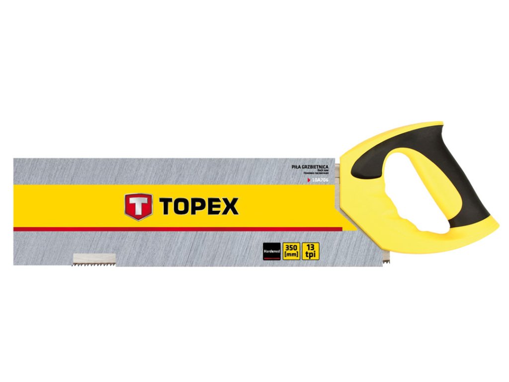 Spätná píla TOPEX (ref. 10A706) s dĺžkou čepele 350 mm. Určené najmä na priame rezanie. Čepeľ je vyrobená z kvalitnej kalenej ocele. Veľmi účinné ozubenie s 13 zubami na palec zlepšuje prácu s výrobkom. Výstuž na zadnej strane, ktorá zabraňuje deformácii čepele počas práce, v kombinácii s jemným vrúbkovaním umožňuje presné rezanie hrán. Ergonomická plastová rukoväť umožňuje presné vedenie a protišmykový povlak zabraňuje vykĺznutiu noža z ruky, čím zabezpečuje vysoký komfort práce. Značka TOPEX je určená pre domácich majstrov.