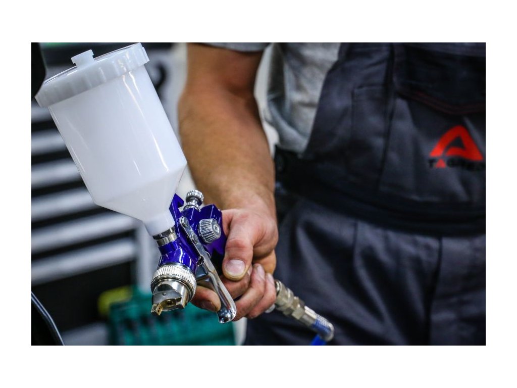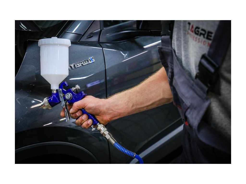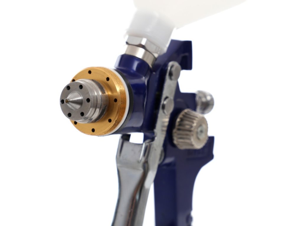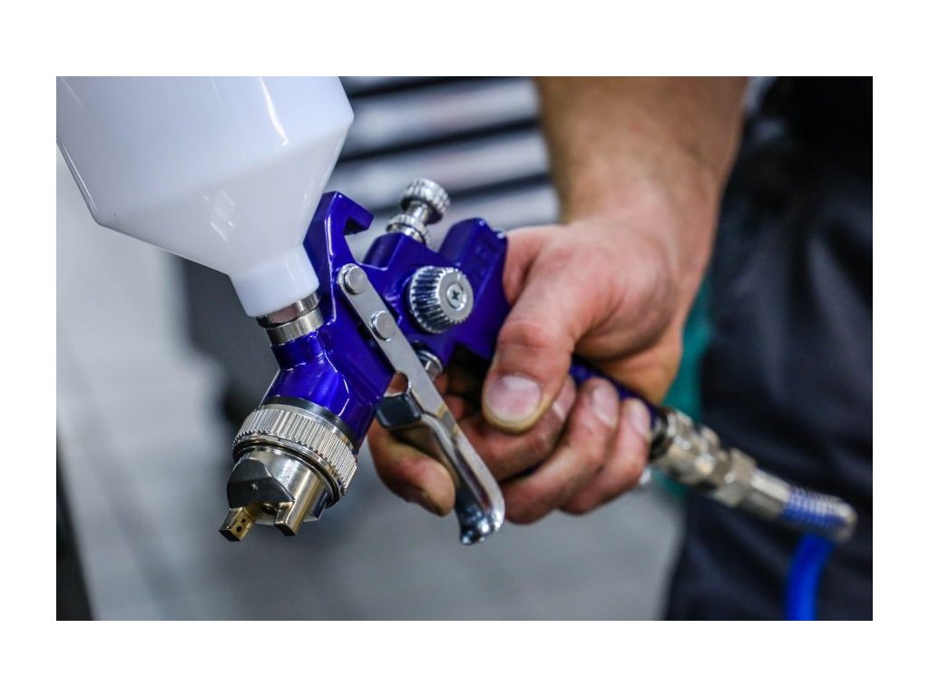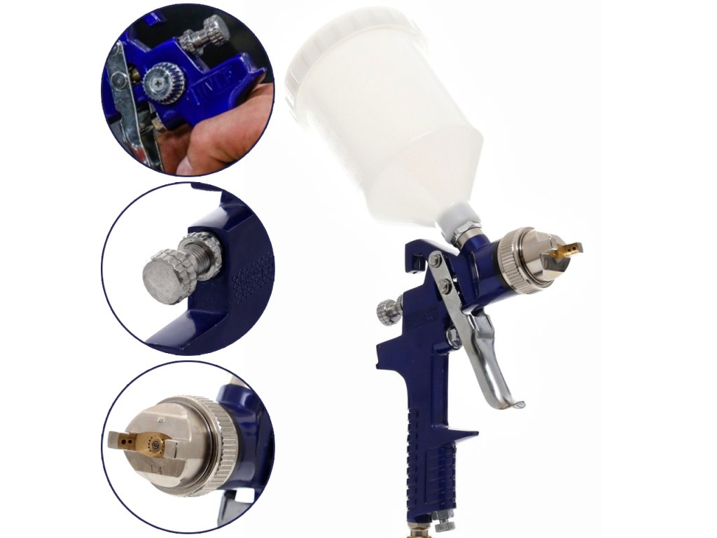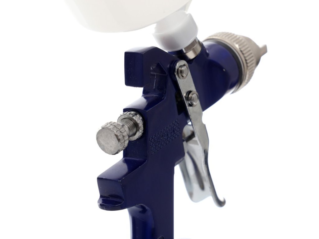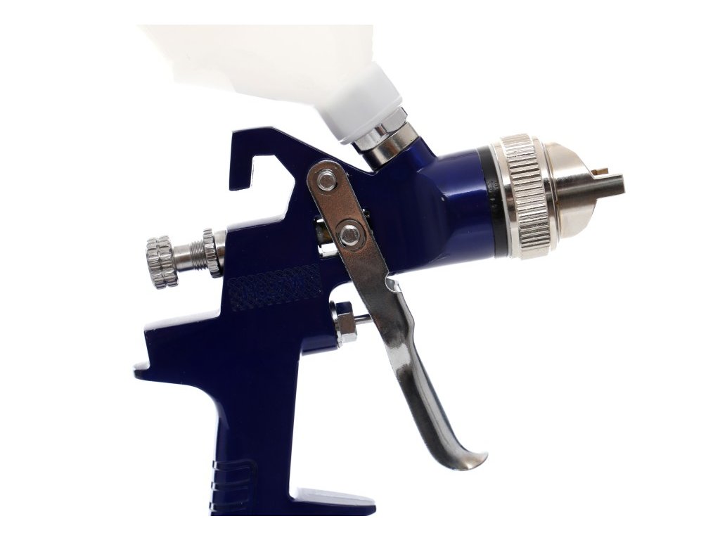 Vysoko kvalitná lakovacia pištoľ vybavená tromi regulátormi: vzduchu, farby a prúdu. Pistola je vybavená nezávislým mechanizmom spúšťania vzduchu a farby. Vďaka tomuto riešeniu sa po ľahkom stlačení spúšte z trysky uvoľní stlačený vzduch a po zvýšení tlaku na spúšť sa uvoľní farba. To má veľký vplyv na kvalitu lakovania.