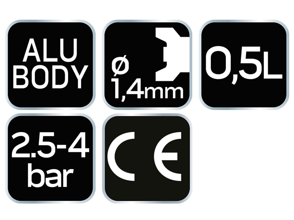 striekacia pištoľ NEO s hornou nádržou s objemom 0,5 l. Má dýzu s priemerom 1,4 mm. Zabezpečuje efektívnu a presnú prácu. S nastavením tlaku v 2 rozsahoch. To umožňuje prispôsobiť výkon pištole typu farby a povrchu. Maximálny pracovný tlak do 4 barov. Certifikát CE zaručuje súlad s európskymi bezpečnostnými normami. Značka NEO spĺňa očakávania profesionálov.