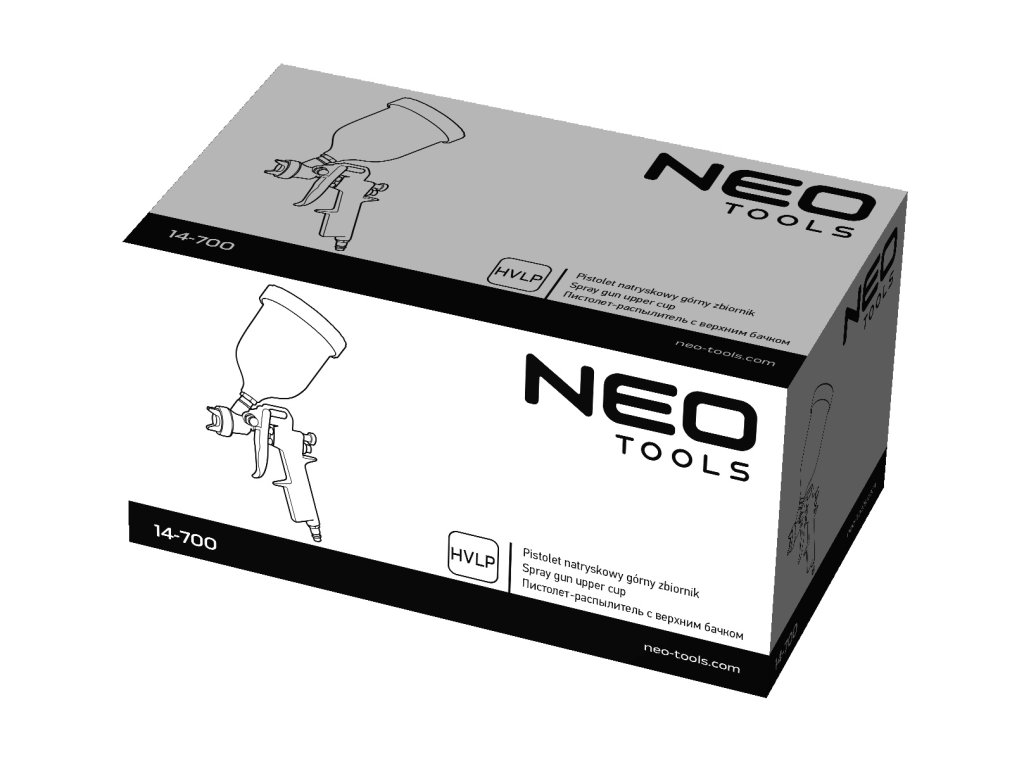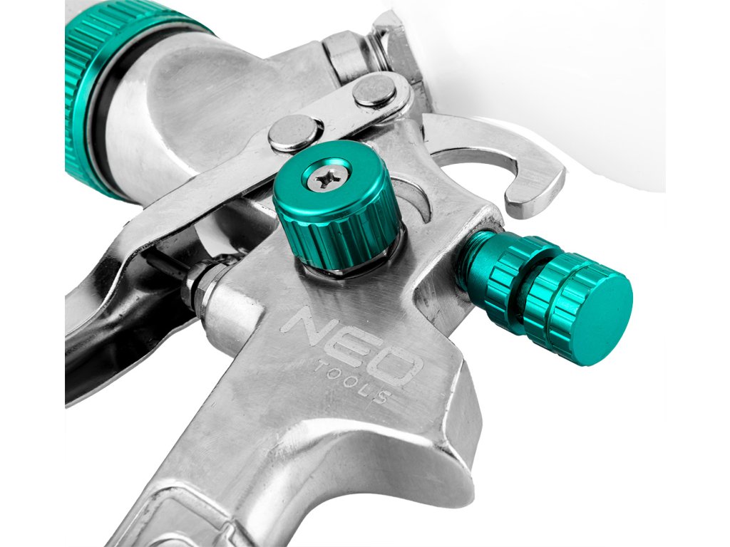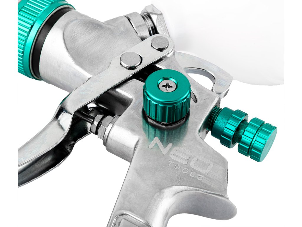 striekacia pištoľ NEO s vrchnou nádržou s objemom 0,6 l. Striekacia pištoľ HVLP dosahuje vysokú účinnosť pri nízkom tlaku vzduchu, čo sa prejavuje v nižšej spotrebe farby. Priemer dýzy je 1,4 mm. S nastavením tlaku v 3 rozsahoch. To umožňuje prispôsobiť výkon pištole typu farby a povrchu. Zabezpečuje efektívnu a presnú prácu. Maximálny pracovný tlak do 4 barov. Certifikát CE zaručuje súlad s európskymi bezpečnostnými normami. Značka NEO spĺňa očakávania profesionálov.