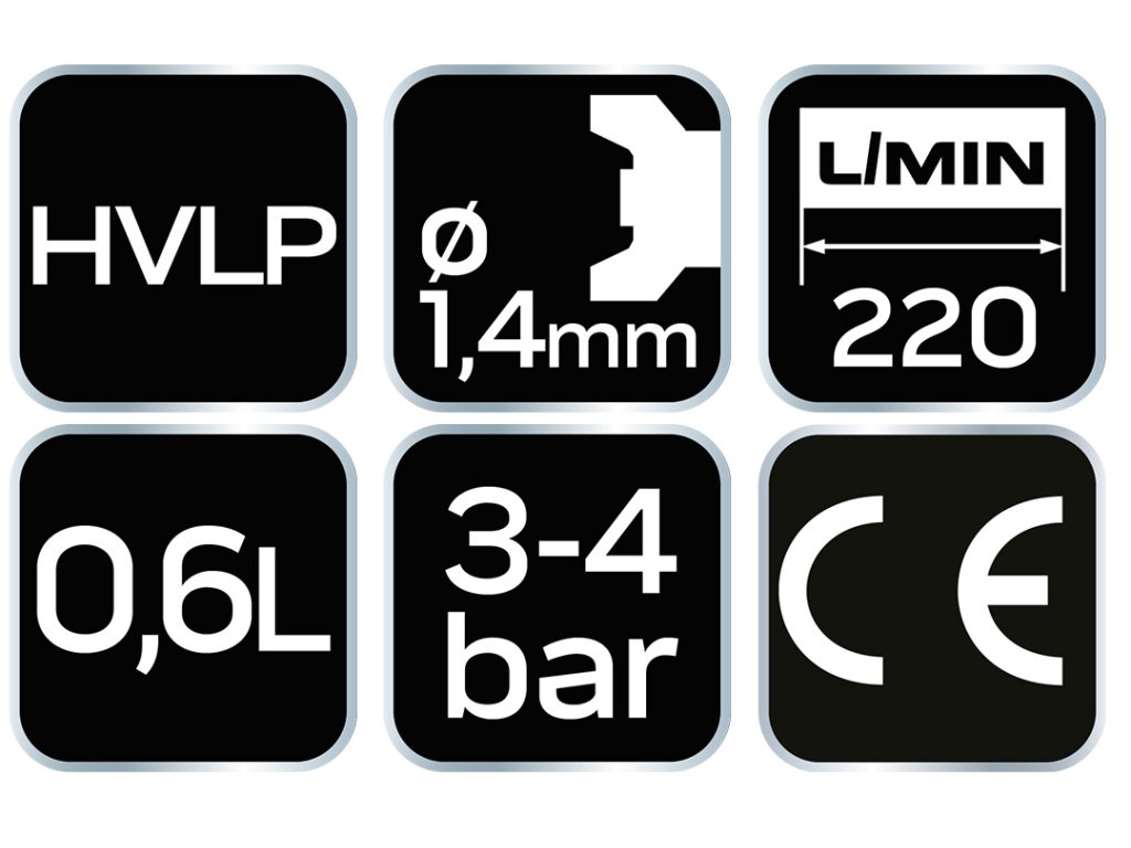 Striekacia pištoľ s horným pohárom 0,6 l, 1,4 mm, spotreba vzduchu 250–350 l/min., Max. pracovný tlak 4 bar, 3 nastavenia, HVLP, CE