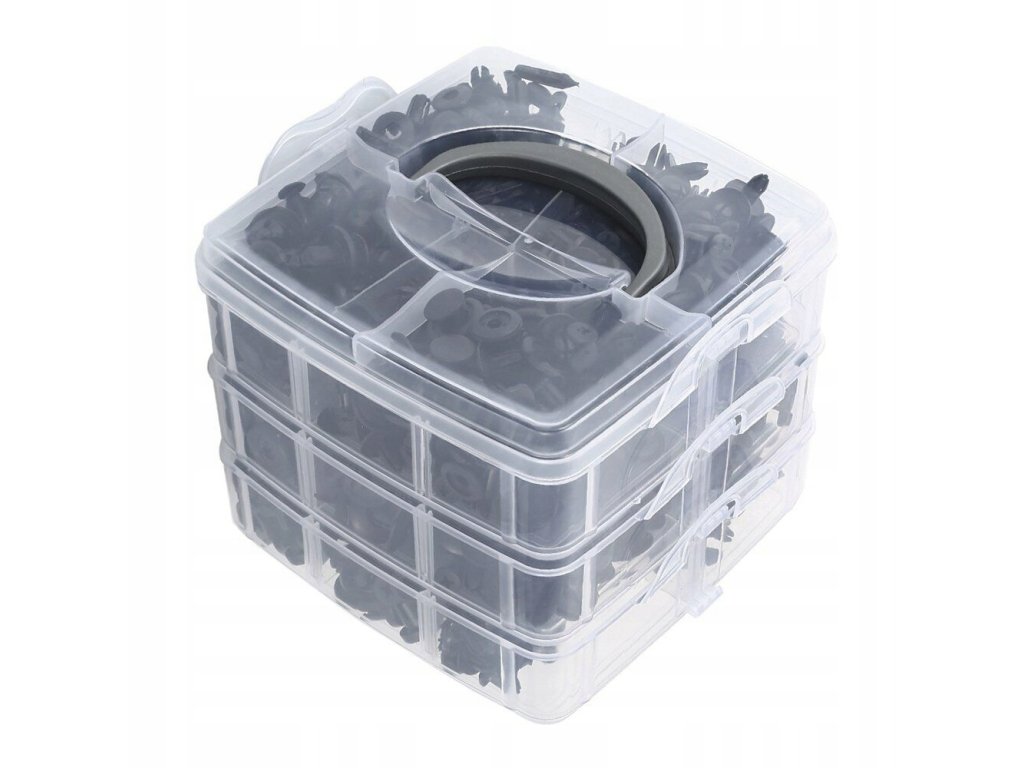 Sada kolíkov na upevnenie, 845 kusov, je praktický a všestranný set určený na upevnenie karosérie, čalúnenia, blatníkov, nárazníkov a poťahov v rôznych typoch automobilov.
