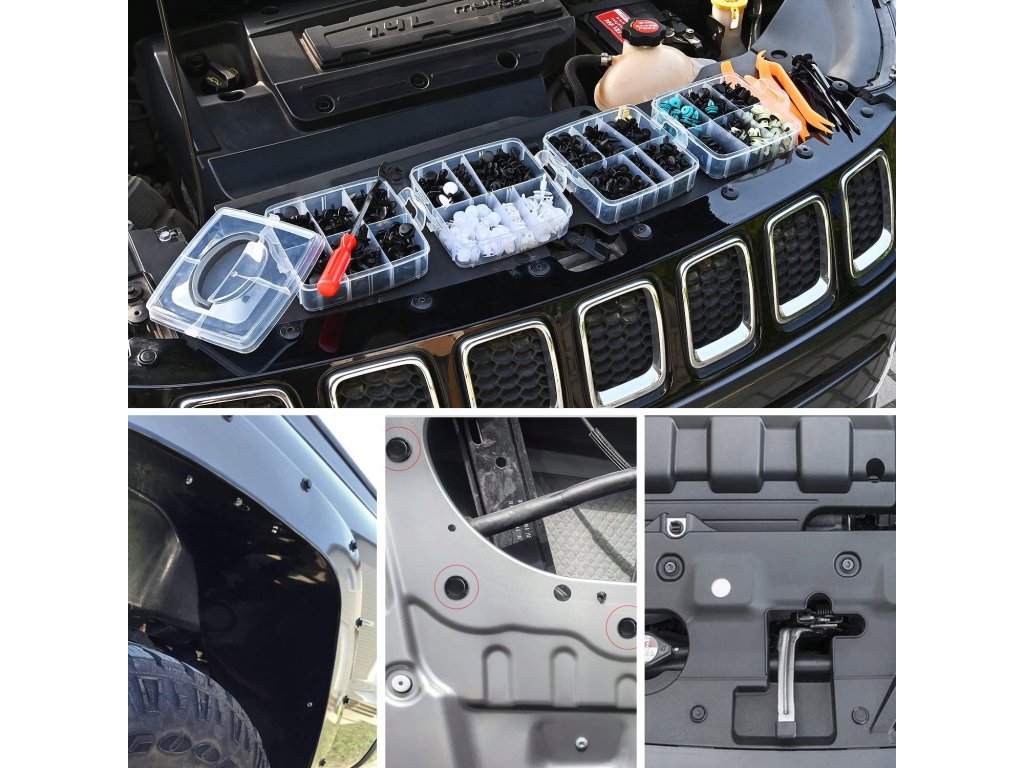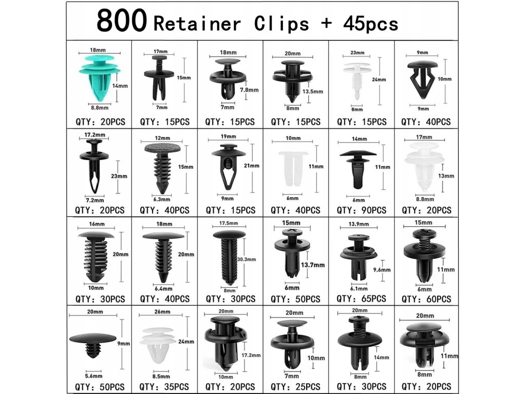 Sada kolíkov na upevnenie – 845 kusov sú praktická a univerzálna sada určená na upevnenie karosérie, čalúnenia a poťahov v rôznych typoch automobilov. Klipy sú vyrobené z odolného plastu, ktorý odoláva prasklinám a opotrebovaniu. Celá sada je uložená v praktickom puzdre s rukoväťou, čo uľahčuje organizáciu a prenášanie.