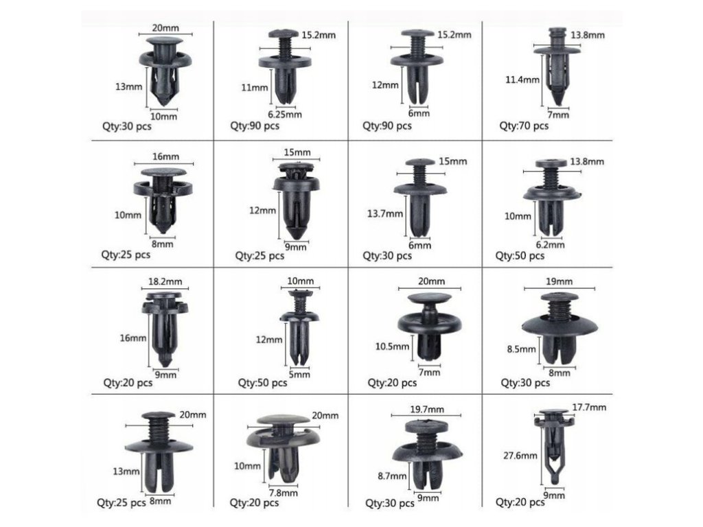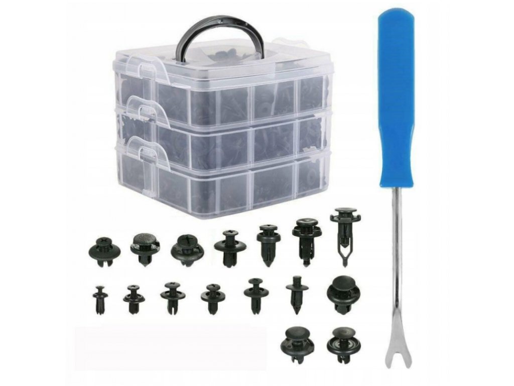 Sada kolíkov a klipov na upevnenie čalúnenia, blatníkov, nárazníkov a ďalších súčastí automobilov. Súprava obsahuje 625ks klipov rôznych tvarov a veľkostí a 1ks sťahováka.