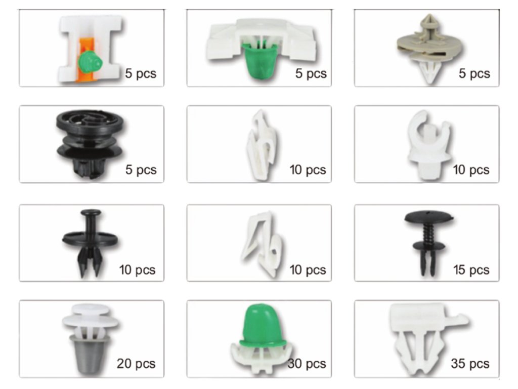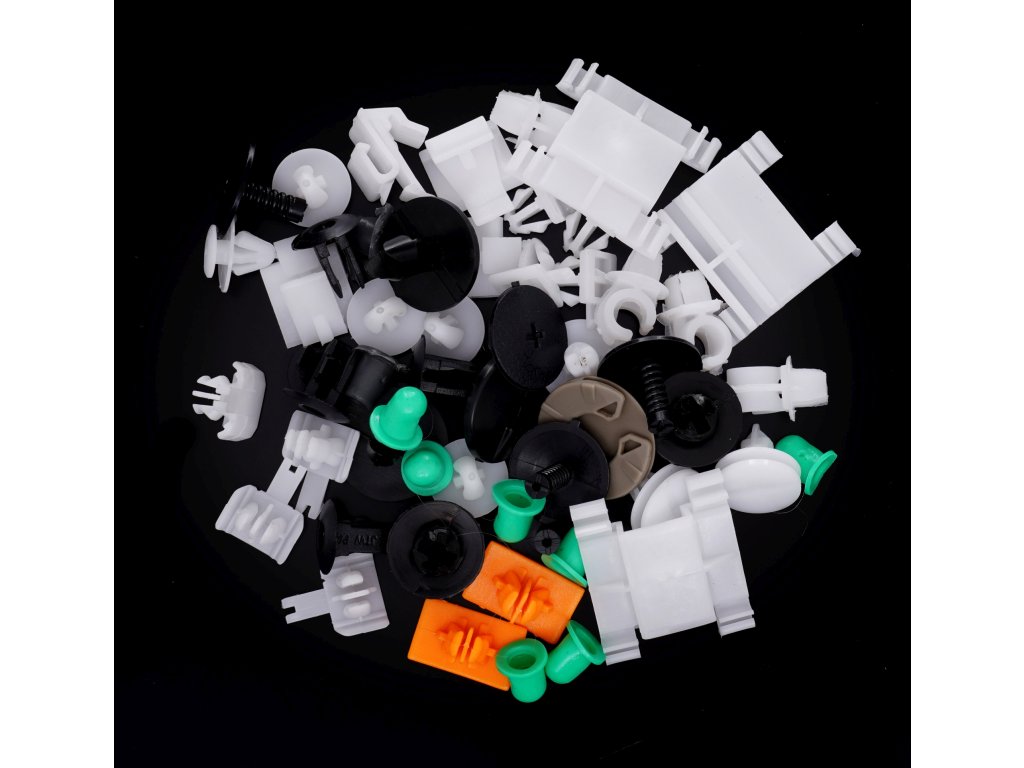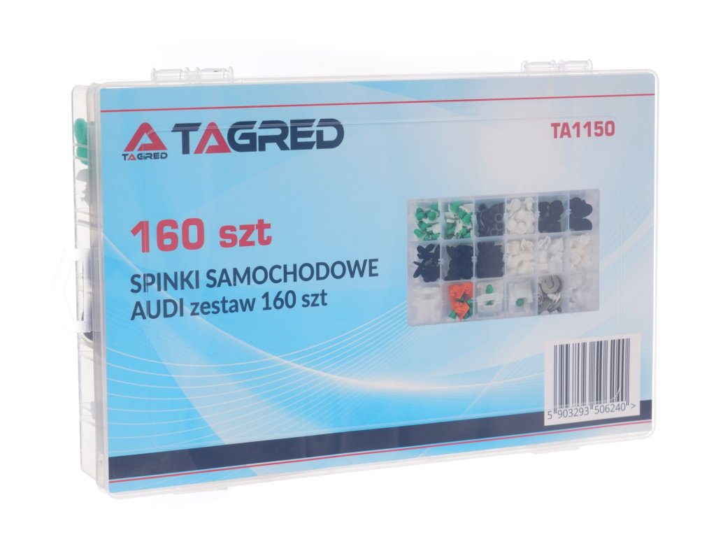 Sada plastových spôn pre automobily značky AUDI. Balenie obsahuje 12 typov spôn, spolu 160 spôn. Celok je zabalený v krabici s praktickými priehradkami.