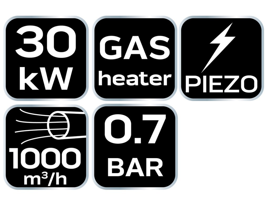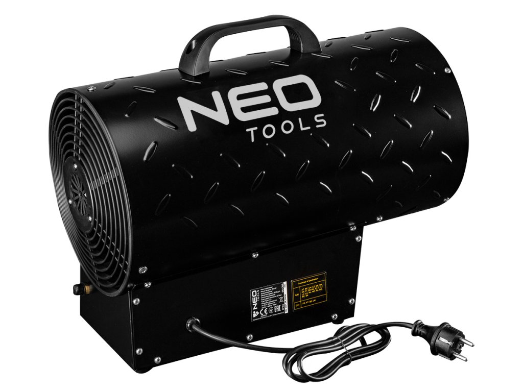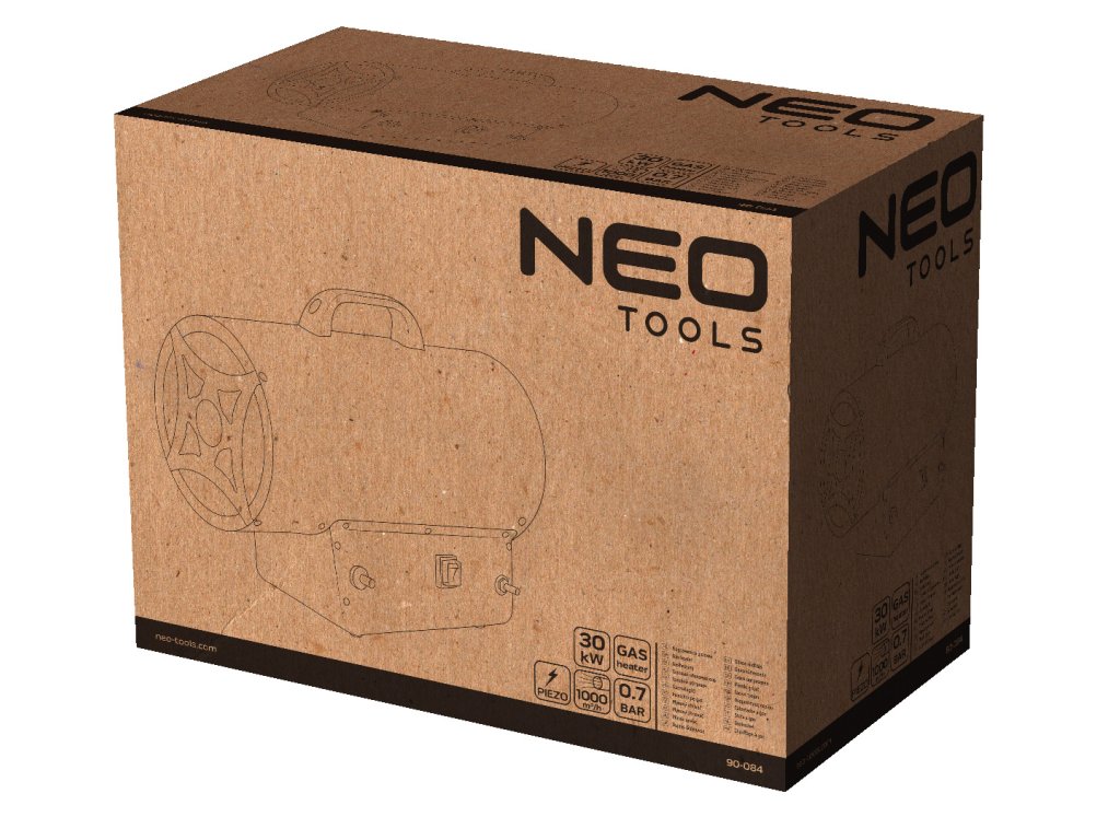 Plynový ohrievač NEO (ref. 90-084) s piezoelektrickým zapaľovaním a výkonom 30 kW je prenosný zdroj tepla, ktorý je určený na vykurovanie priestorov, ako sú haly, sklady, staveniská. Jednotka má ochranu proti prehriatiu a úniku plynu. Ohrievač je poháňaný propán-butánom. Prietok vzduchu je 1000 m? za hodinu. Sada obsahuje redukciu tlaku a 1,5 m hadicu.