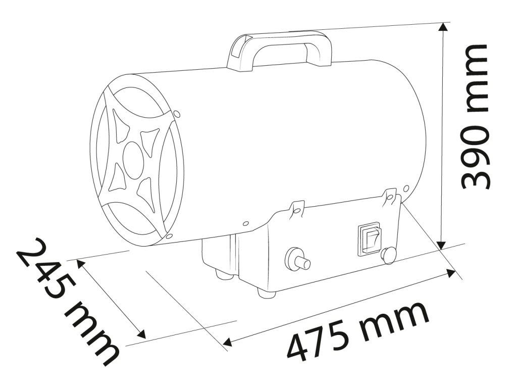 Plynový ohrievač 30kW, tlak 0,7 bar, spotreba paliva 2,18 kg/h, prietok vzduchu 1000 m3/h, reduktor tlaku, 1,5m hadica, piezo