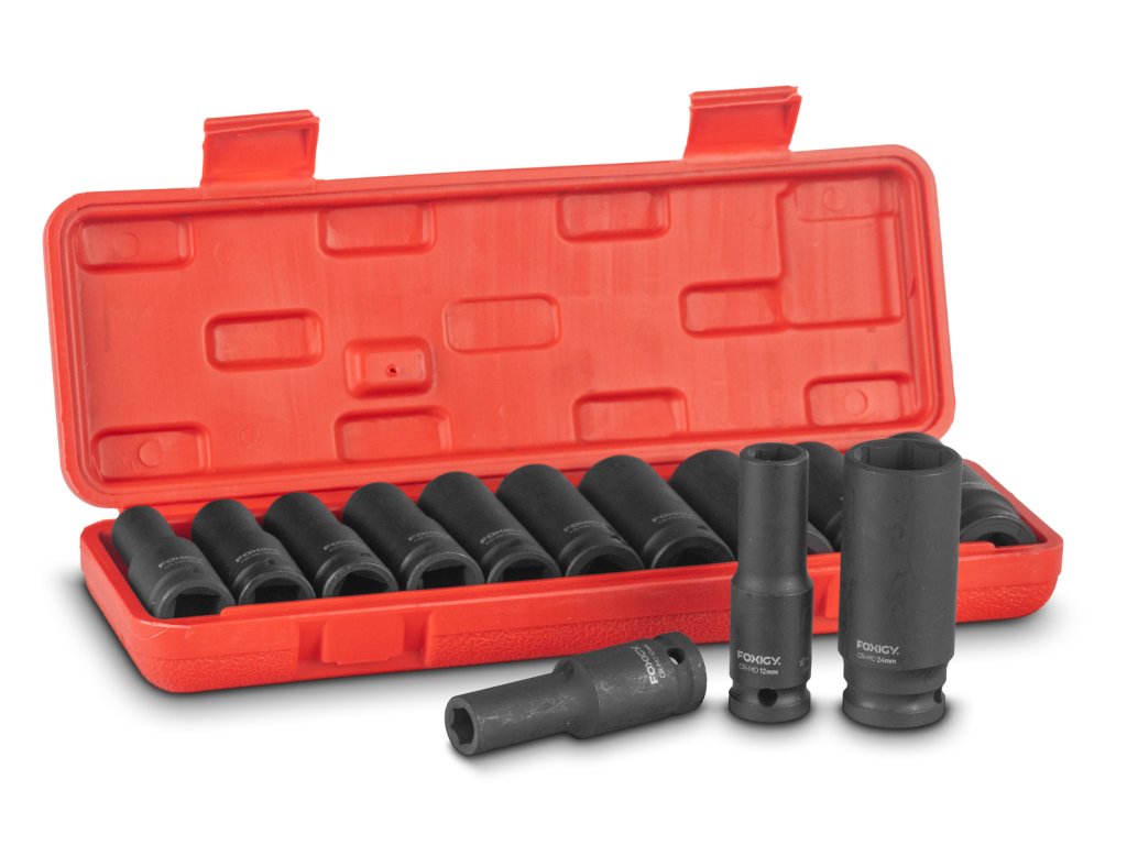 Zvýhodnený set obsahuje profesionálny pneumatický rázový uťahovák Foxigy 1/2" s krútiacim momentom 1560 Nm a Foxigy sadu rázových nadstavcov 1/2" 78mm 10ks 10-24mm.