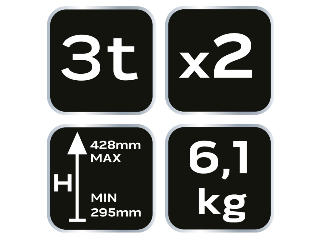 3 t automobilový zdvihák, 295-415 mm, západkový zámok výšky, 2 ks, Certifikát TÜV M+T