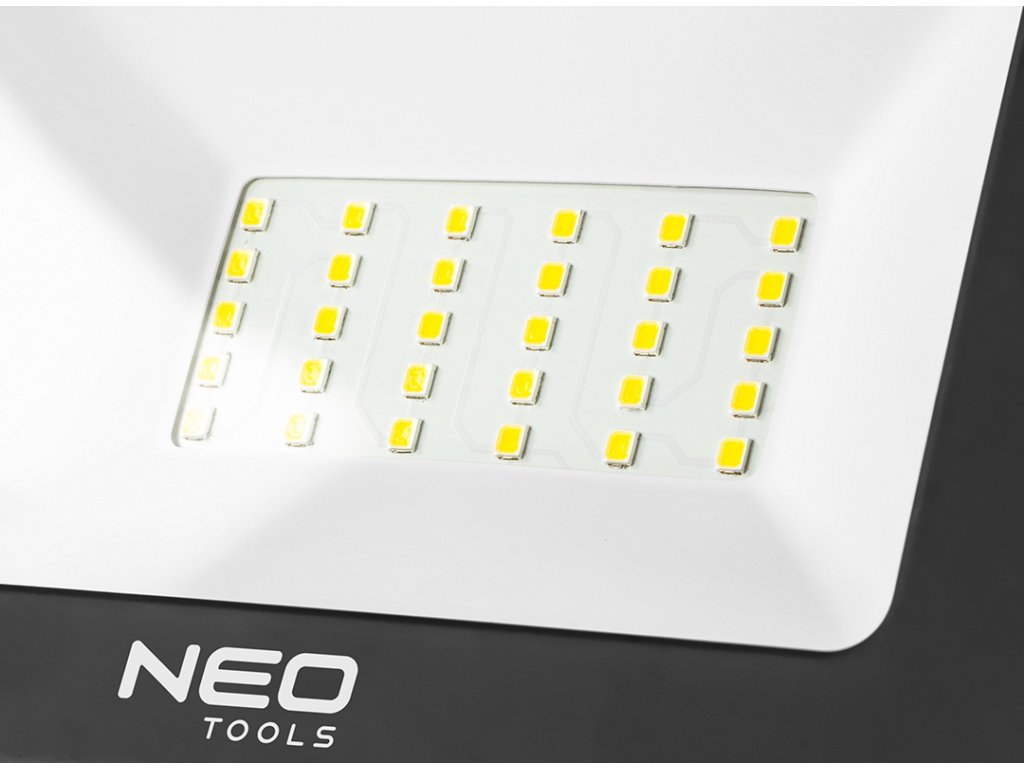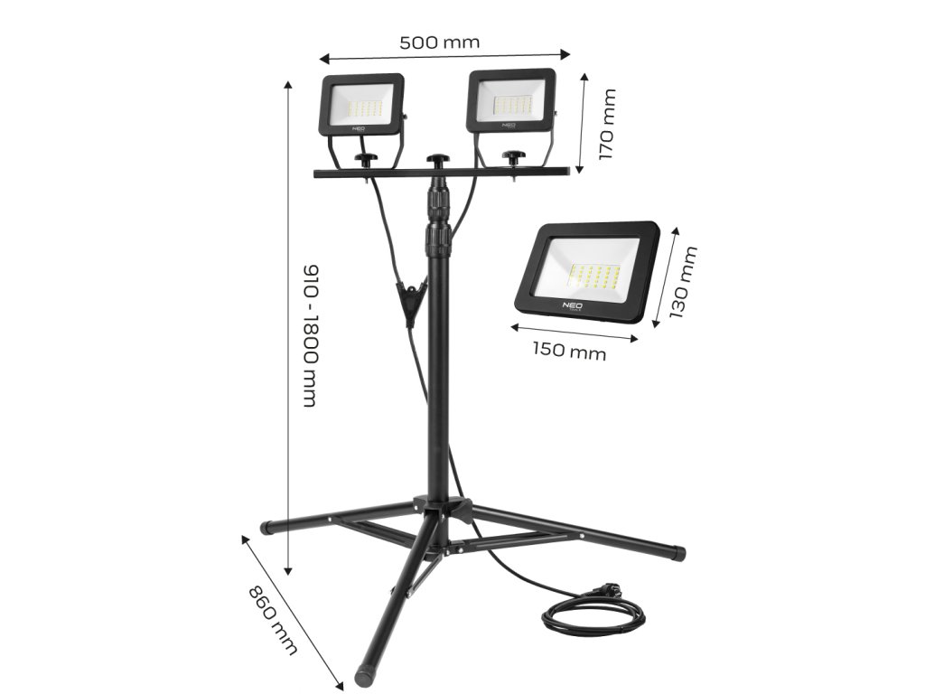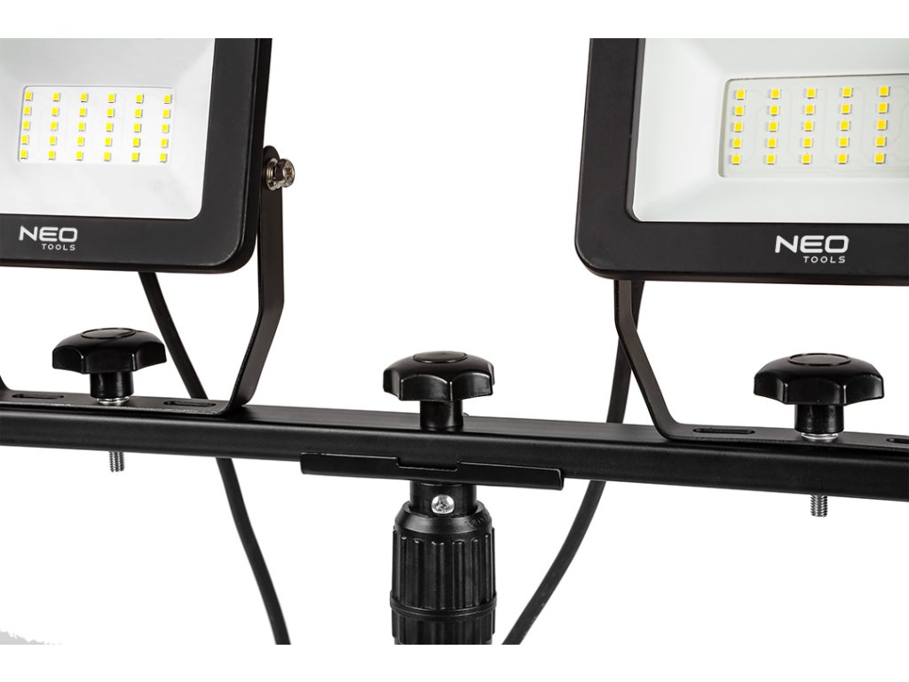 Dvojitý statívový reflektor NEO je vybavený LED diódami SMD s výkonom 2 x 30 W a svetelným tokom 5400 lúmenov. Je určený na použitie pri opravách a stavebných prácach, ako aj v dielni alebo fotografickom štúdiu. Osvetľovač je umiestnený na statíve s nastaviteľnou výškou a smerom svetla. Maximálna výška je 1,8 m. Telo je vyrobené z hliníka. Stupeň krytia IP65 umožňuje použitie reflektora vo vonkajšom prostredí. Súlad s európskymi bezpečnostnými normami potvrdzuje certifikát CE.