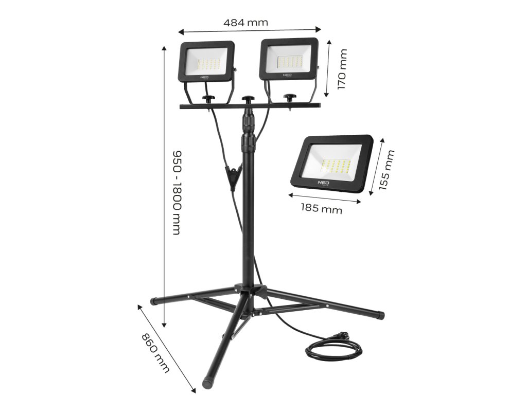Dvojitý statívový reflektor NEO je vybavený LED diódami SMD s výkonom 2 x 50 W a svetelným tokom 8500 lúmenov. Je určený na použitie pri opravách a stavebných prácach, ako aj v dielni alebo fotografickom štúdiu. Osvetľovač je umiestnený na statíve s nastaviteľnou výškou a smerom svetla. Maximálna výška je 1,8 m. Telo je vyrobené z hliníka. Stupeň krytia IP65 umožňuje použitie reflektora vo vonkajšom prostredí. Súlad s európskymi bezpečnostnými normami potvrdzuje certifikát CE.