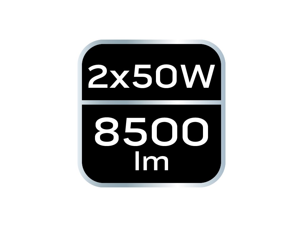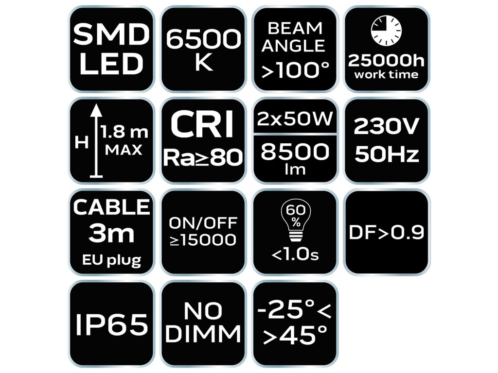 Výkon jedného reflektora NEO 2 x 50W, 8500 lúmenov, 230V 50Hz, SMD LED, prevádzkový čas 25 000h, 6500K, hliníkové telo, IP65, CRI Ra ? 80, uhol svietenia 120 stupňov, ON/OFF ? 15 000 cyklov, kábel so zástrčkou 3m, prevádzková teplota -25<>+45, účinník >0,9, čas horenia do 60% <1s, teleskopický statív max.8