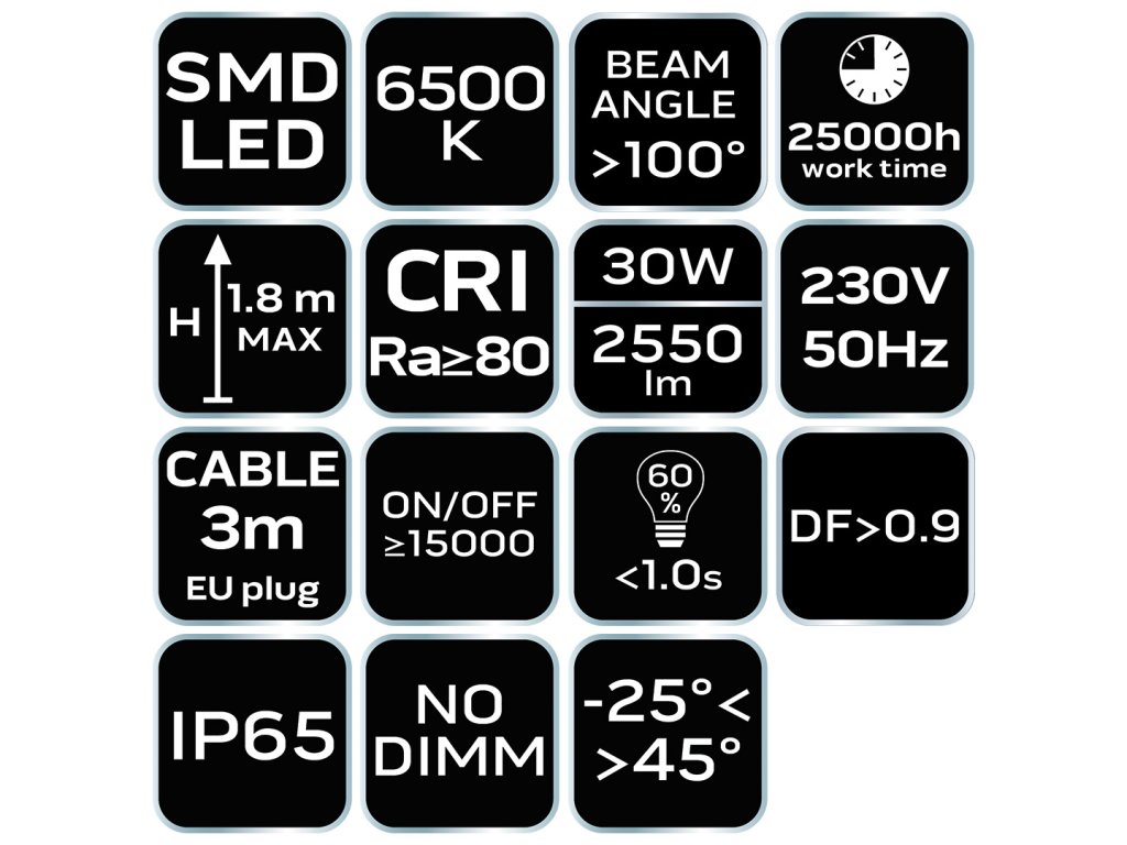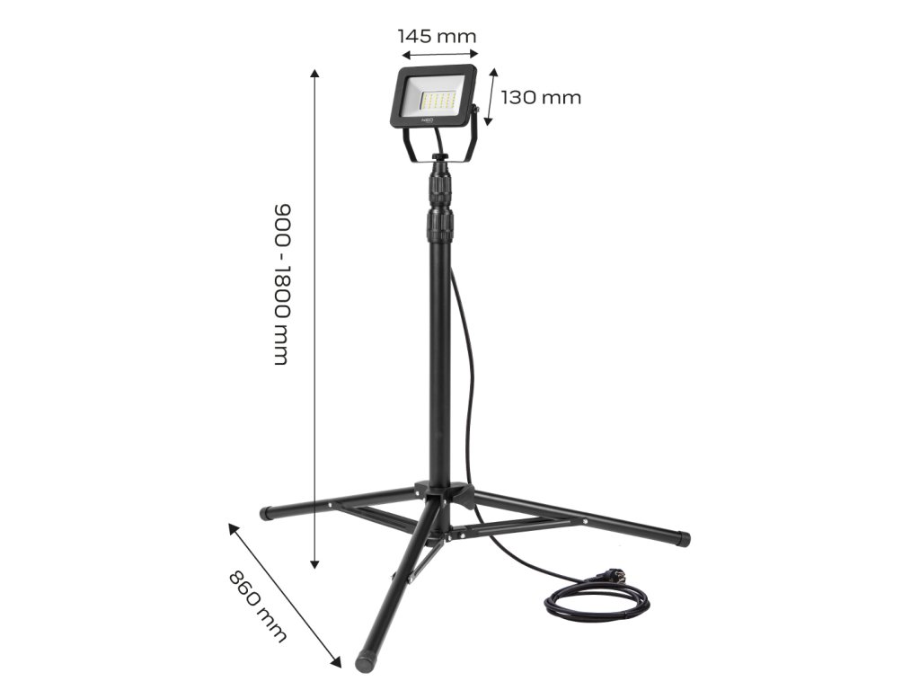 NEO jednoduchý reflektor výkon 30W, 2550 lúmenov, 230V 50Hz, SMD LED, doba prevádzky 25 000h, 6500K, hliníkové telo, IP65, CRI Ra ? 80, uhol svietenia 120 stupňov, ON/OFF ? 15 000 cyklov, kábel so zástrčkou 3m, prevádzková teplota -25<>+45, účinník >0.9, doba horenia do 60% <1s, teleskopický statív max. 1,8