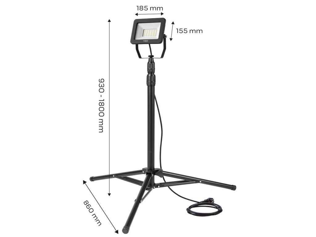 Jednolanový reflektor NEO je vybavený 50 W SMD LED diódami a svetelným tokom 4250 lúmenov. Je určený na použitie pri opravách a stavebných prácach, ako aj v dielni alebo fotografickom štúdiu. Osvetľovač je umiestnený na statíve s nastaviteľnou výškou a smerom svetla. Maximálna výška je 1,8 m. Telo je vyrobené z hliníka. Stupeň krytia IP65 umožňuje použitie reflektora vo vonkajšom prostredí. Súlad s európskymi bezpečnostnými normami potvrdzuje certifikát CE.