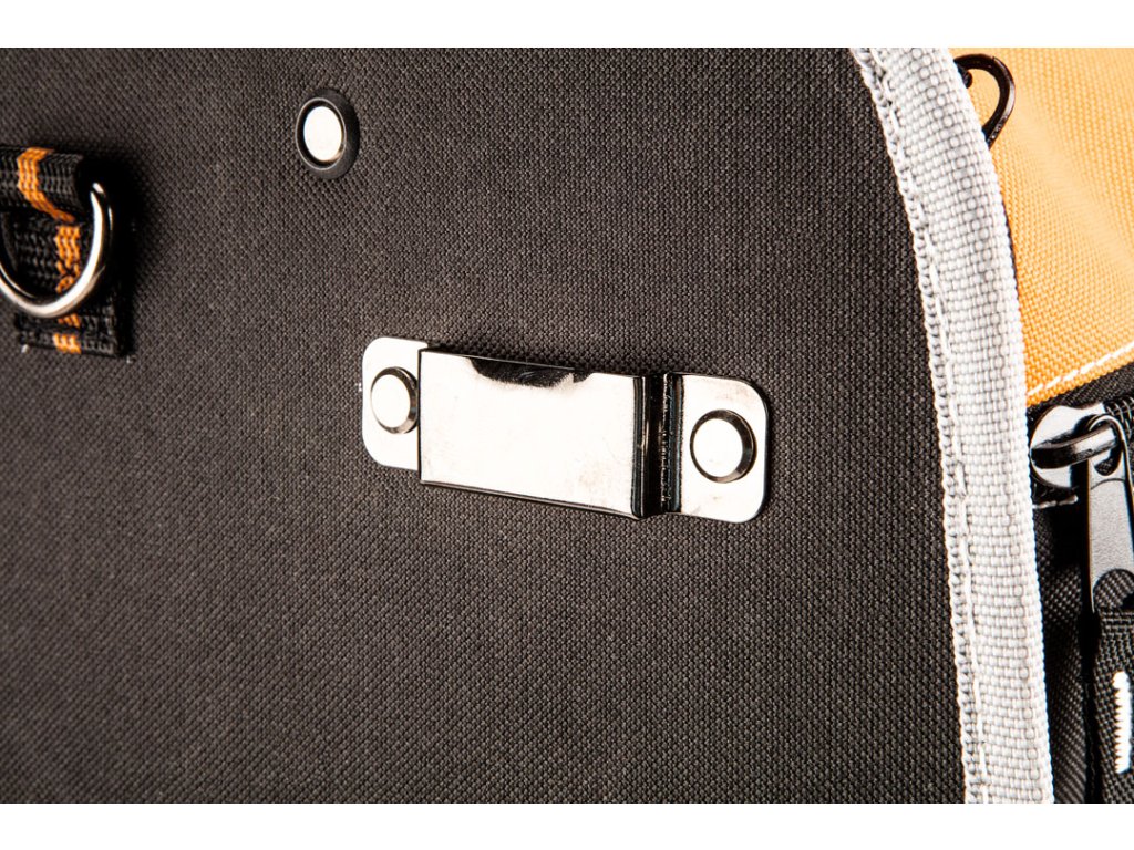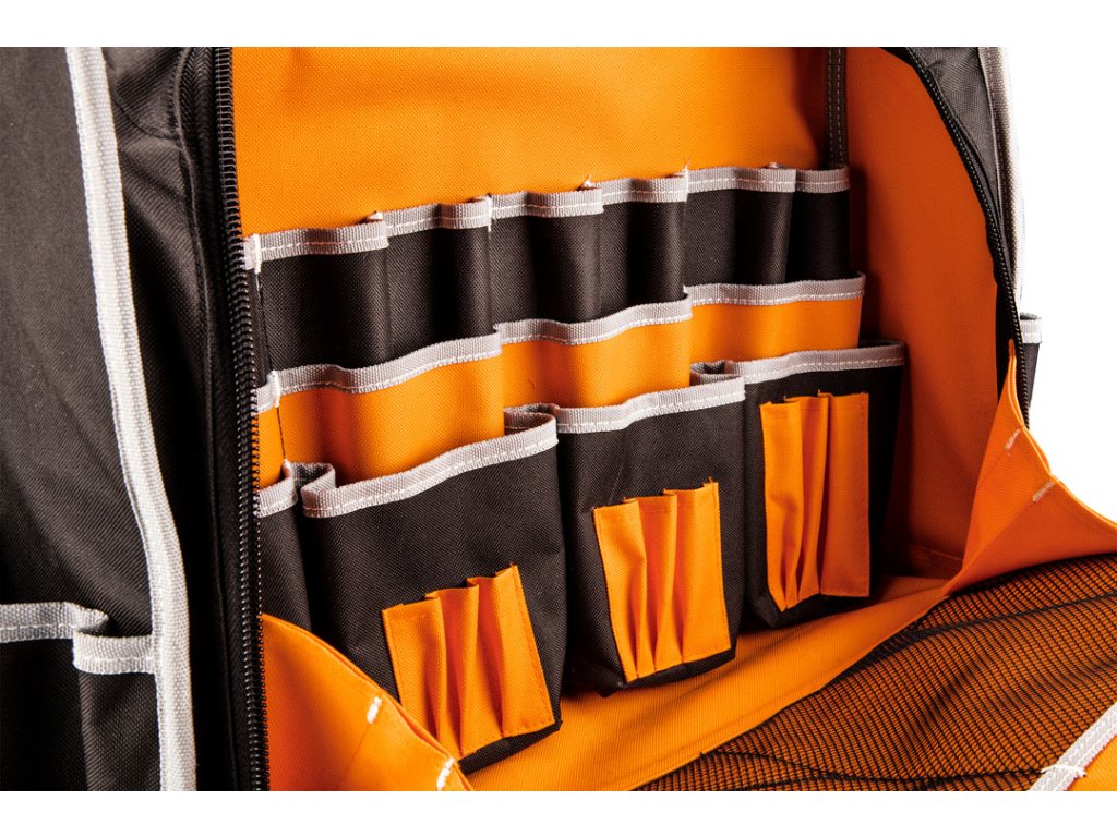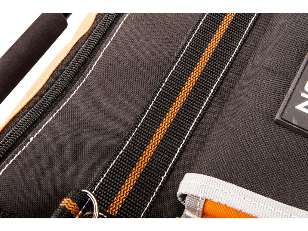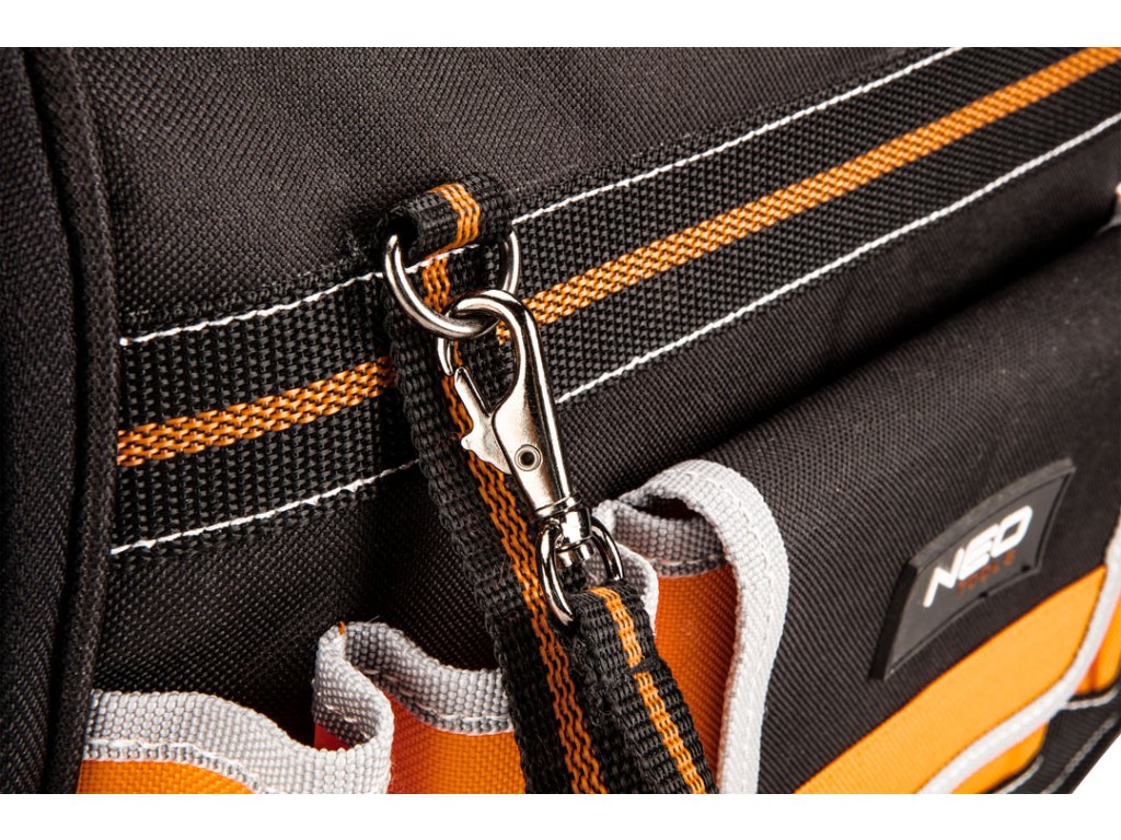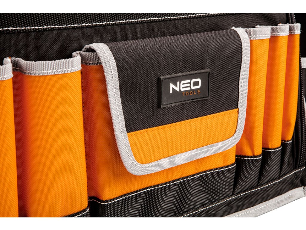 Montérska taška NEO (ref. č. 84-301) zhotovená z polyestru 600 D, ktorý zaručuje dlhú životnosť tašky. Má spevnené dno so stojanmi, ktoré chráni obsah počas práce v ťažkých podmienkach. Taška je vybavená pevnou rukoväťou a pásom na prenášanie. Jej veľkou výhodou je veľké množstvo vreciek: 12 vonkajších a 32 vnútorných. Značka NEO spĺňa očakávania profesionálov.