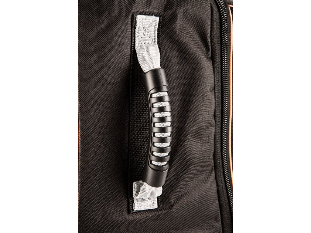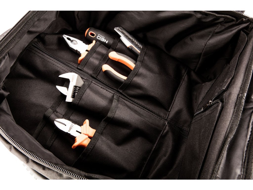 Montérsky plecniak na kolesách NEO (ref. č. 84-303) zhotovený z odolného polyestru 600 D, ktorý zaručuje dlhú životnosť tašky. Teleskopická rukoväť s blokovaním spolu s pevnými kolieskami uľahčí prepravu ťažkého obsahu. Plecniak je vybavený 3 rukoväťami na ručné prenášanie, 20 vnútornými vreckami a vyberateľnou vložkou na nástroje pre uľahčenie práce. Značka NEO spĺňa očakávania profesionálov.