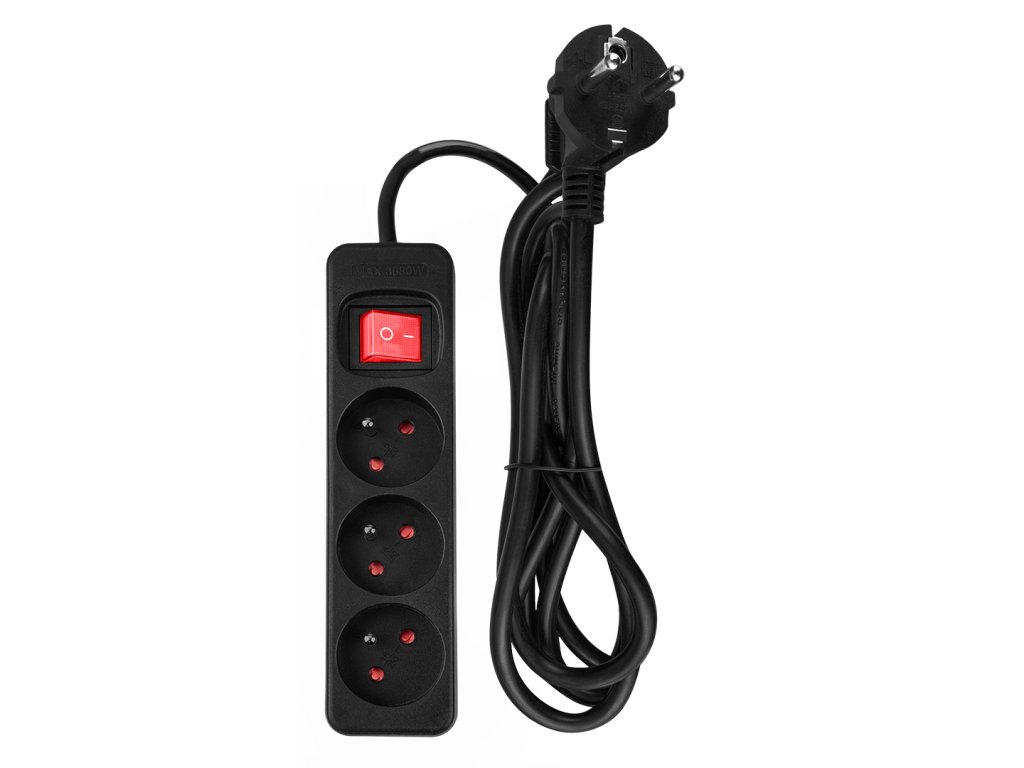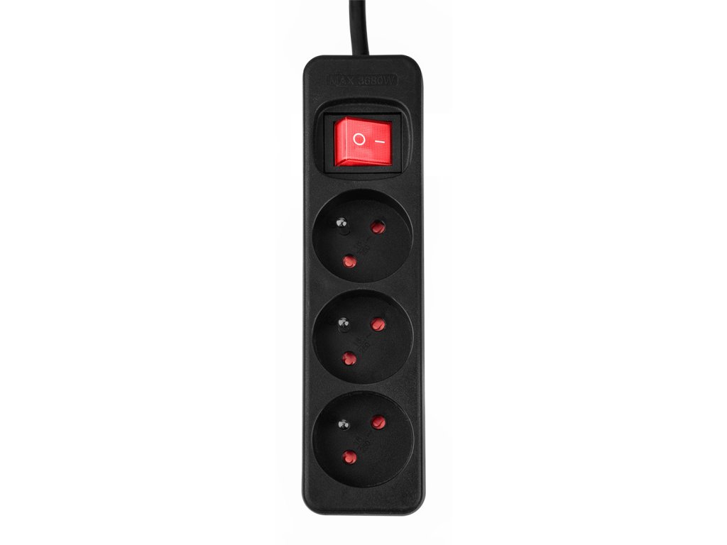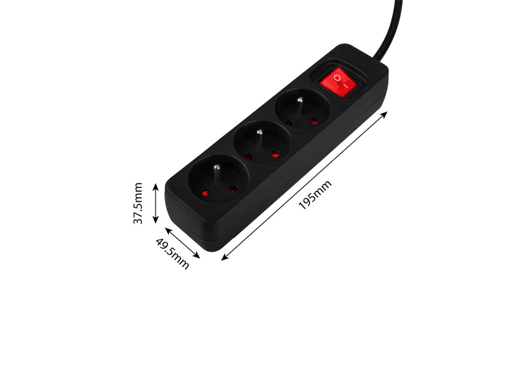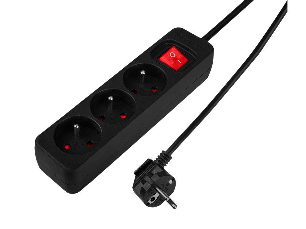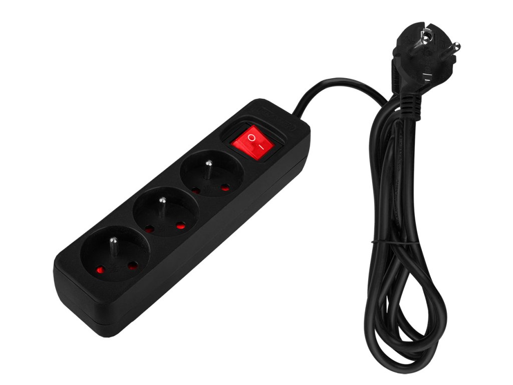 Predlžovací kábel 1,5 m, 3x1,5 mm?, 3 zásuvky, čierny, ON/OFF, 100% medené vodiče, 16 A 230 V, zástrčka E/F, zásuvka E, max. 3680 W