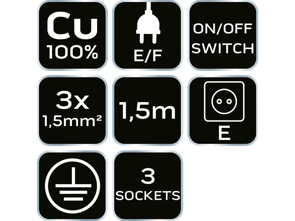 Predlžovací kábel 1,5 m, 3 x 1,5 mm?, 3G, čierny, ON/OFF 90-182 od spoločnosti NEO TOOLS je 1,5 m dlhý predlžovací kábel s 3x 1,5 mm? medenými vodičmi a 3 zásuvkami. Vyznačuje sa čiernou farbou a vypínačom ON/OFF. S menovitým prúdom 16 A pri 230 V a maximálnym výkonom 3680 W je schopný napájať väčšinu spotrebičov. Predlžovacia lišta NEO TOOLS má zástrčku typu E/F a zásuvku typu E. Je to užitočný univerzálny výrobok na bezpečné rozvetvenie napájania.