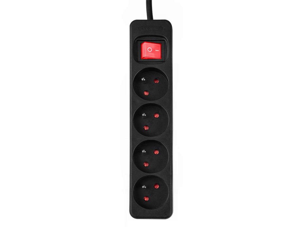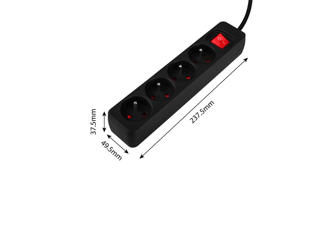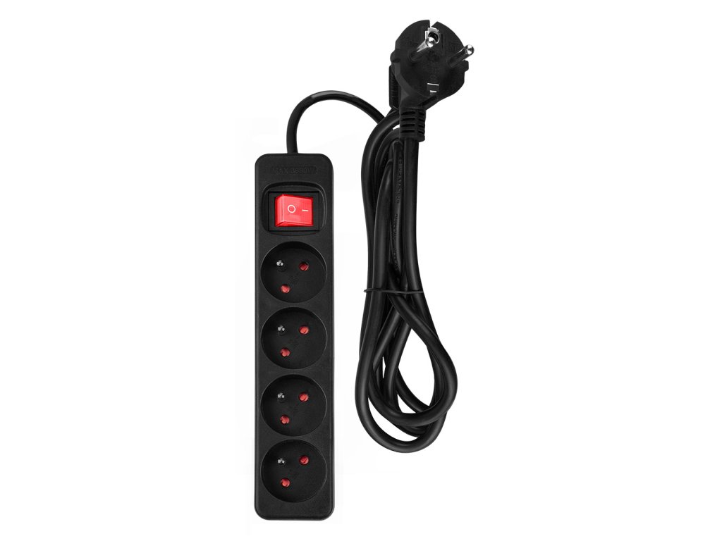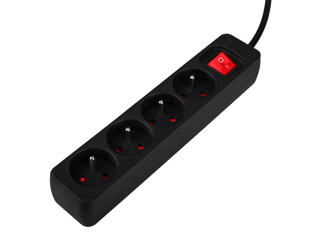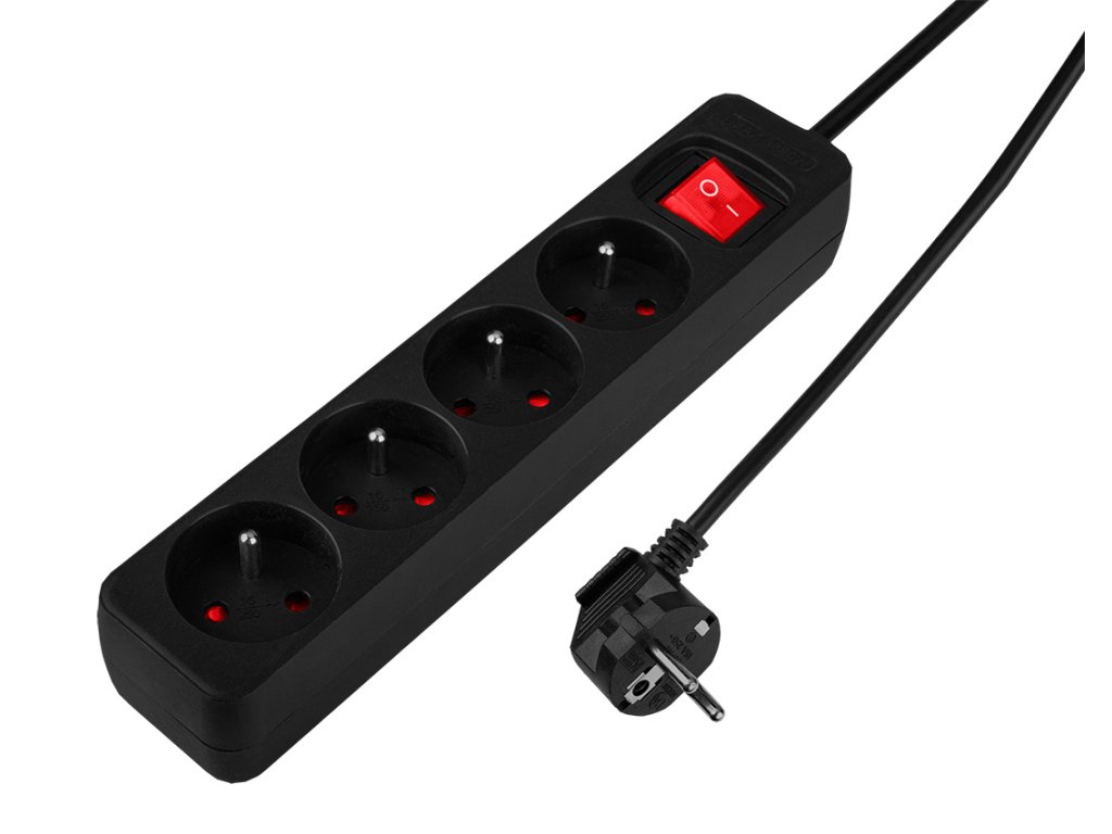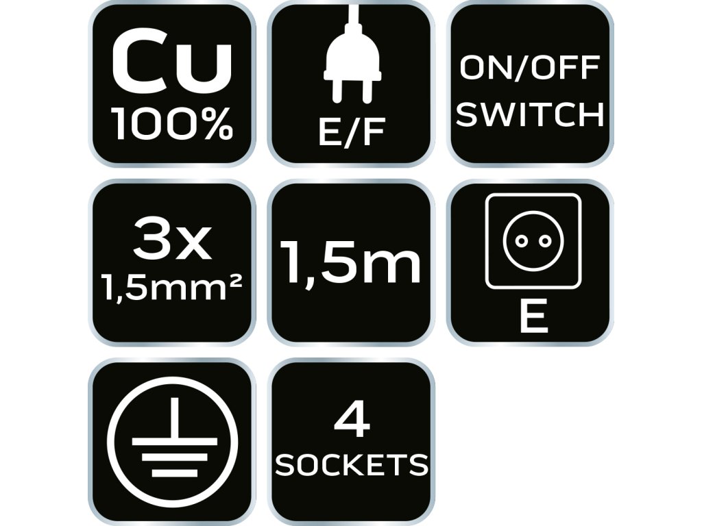 Predlžovací kábel 1,5 m, 3x1,5 mm?, 4 zásuvky, čierny, ON/OFF, 100% medené vodiče, 16 A 230 V, zástrčka E/F, zásuvka E, max. 3680 W