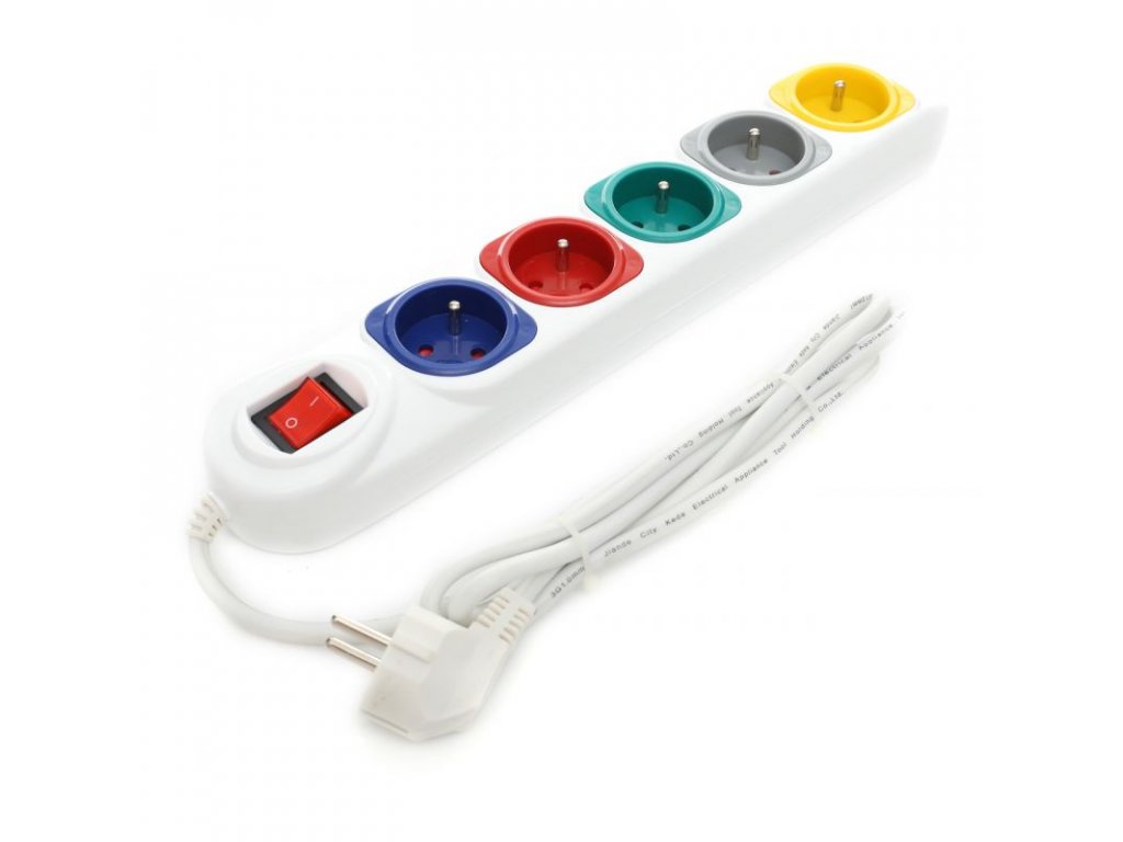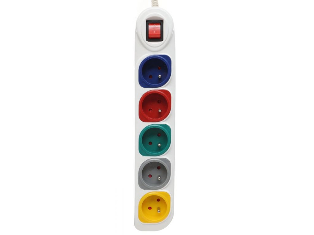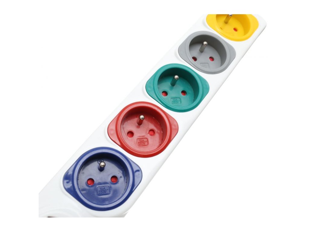 Predlžovačka má 5 zásuviek, ktoré sú farebne odlišené, s centrálnym vypínačom, ako aj s prepäťovou ochranou.