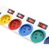 Predlžovačka má 5 zásuviek, ktoré sú farebne odlišené, s uzemňovacími kolíkmi (jednotlivé vypínače ku každej zásuvke), s centrálnym vypínačom, ako aj s prepäťovou ochranou.