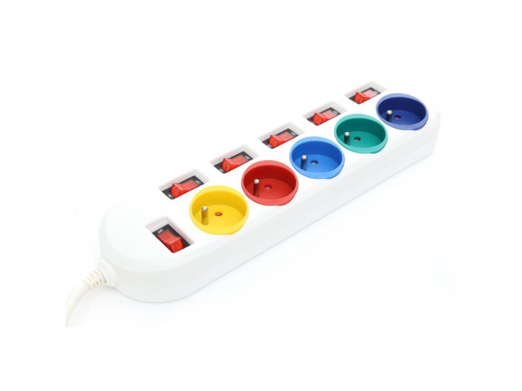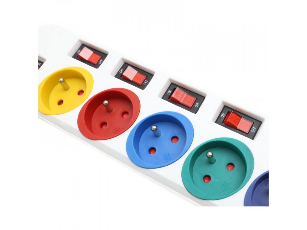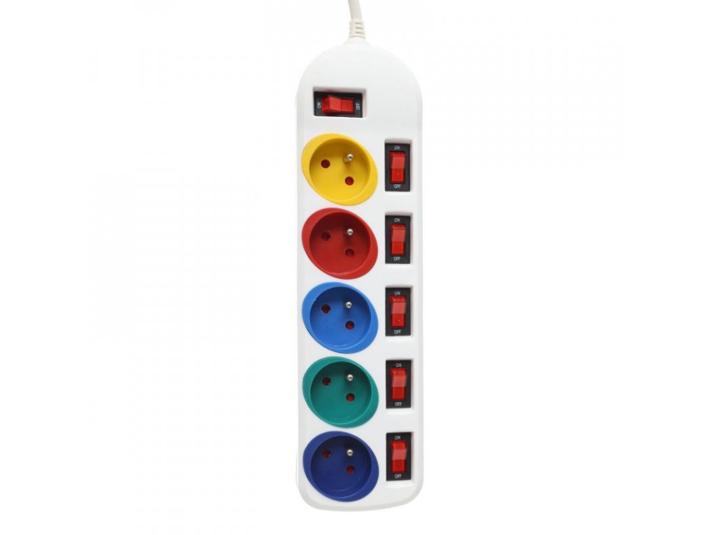 Predlžovačka má 5 zásuviek, ktoré sú farebne odlišené, s uzemňovacími kolíkmi (jednotlivé vypínače ku každej zásuvke), s centrálnym vypínačom, ako aj s prepäťovou ochranou.
