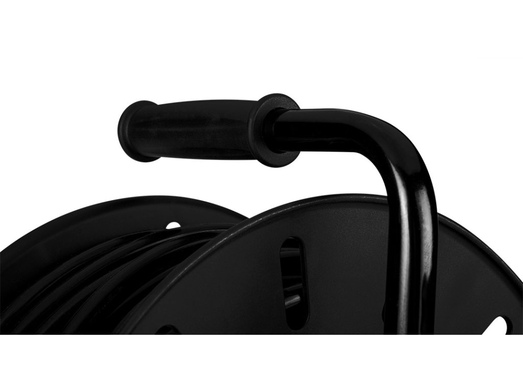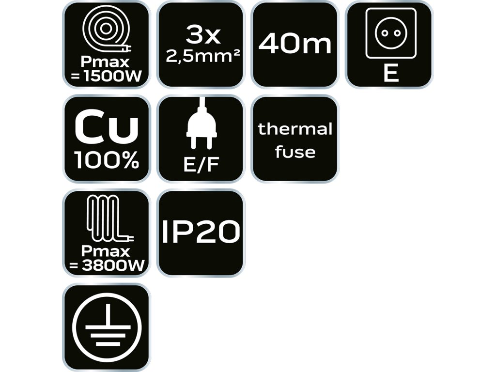 40m predlžovací kábel, 3x2,5mm?, 16A, 3600W, 100% medené vodiče, tepelná poistka, 16A 230V, IP44, navinutý Pmax 1800W, nenavinutý Pmax 3600W, zástrčka E/F, zásuvka typu E, gumová rukoväť, chrániče zásuvky, uzemnenie, plastový bubon, kovový rám