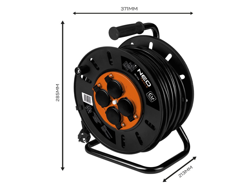40 m predlžovací kábel s cievkou 3 x 2,5 mm? 90-174 od spoločnosti NEO TOOLS s menovitým prúdom 16 A a maximálnym výkonom 3600 W. Predlžovací kábel má vodiče vyrobené zo 100 % medi. Na bezpečnosť jeho používania má vplyv aj prítomnosť tepelnej poistky, krytu zásuvky a uzemnenia. Vyznačuje sa stupňom ochrany IP20. Výkon zasunutého kábla je na maximálnej úrovni 1800 W (pri vysunutí je to 3600 W). Predlžovací kábel NEO TOOLS na cievke má zástrčku typu E/F a zásuvku typu E. Pogumovaná rukoväť na prenášanie, prispieva k pohodlnej preprave. Kovový rám a plastový bubon sa zasa prejavujú v odolnosti pri používaní. Predlžovací kábel NEO TOOLS bude neoceniteľný v situáciách, keď je potrebné pripojiť elektrické zariadenia na miestach vzdialených od sieťového zdroja. Vyznačuje sa univerzálnym použitím.