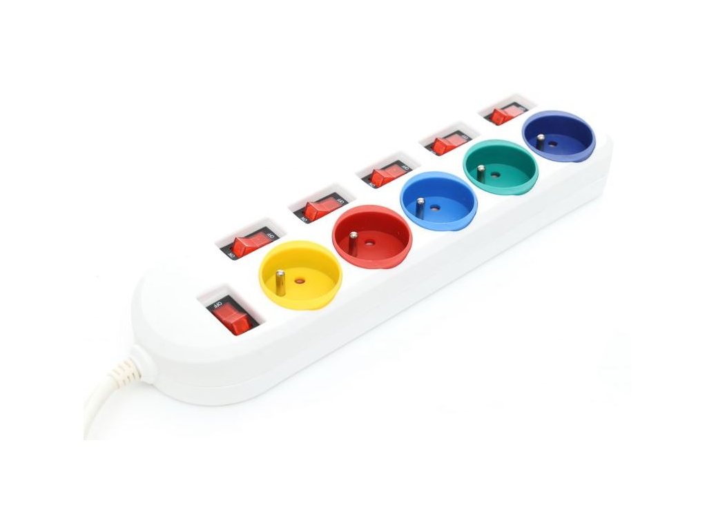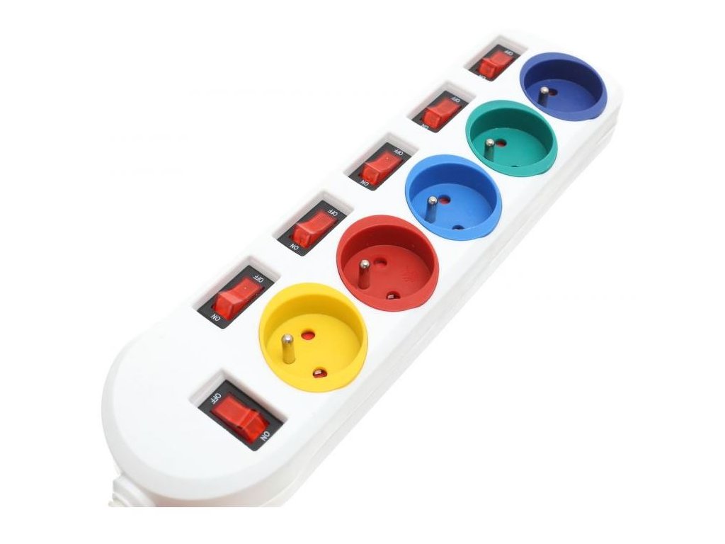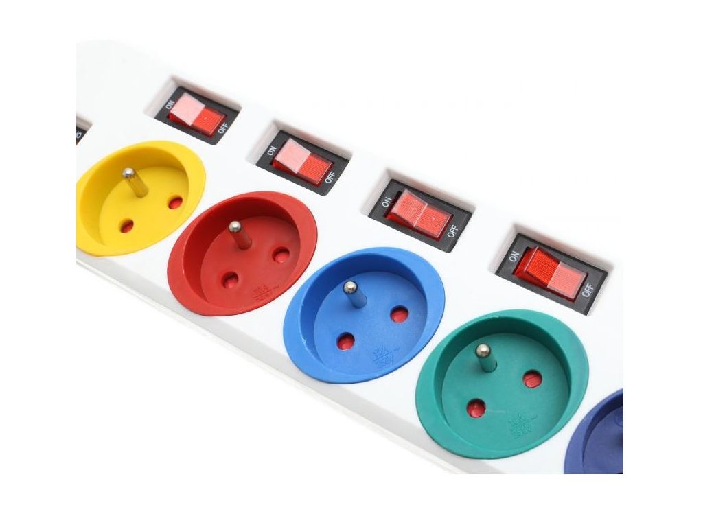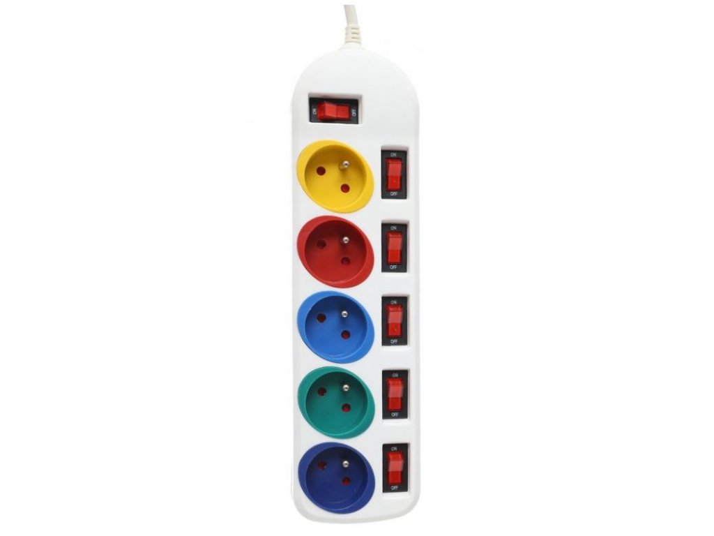 Predlžovačka má 5 zásuviek, ktoré sú farebne odlišené, so samostatnými vypínačmi pre jednotlivé zásuvky.