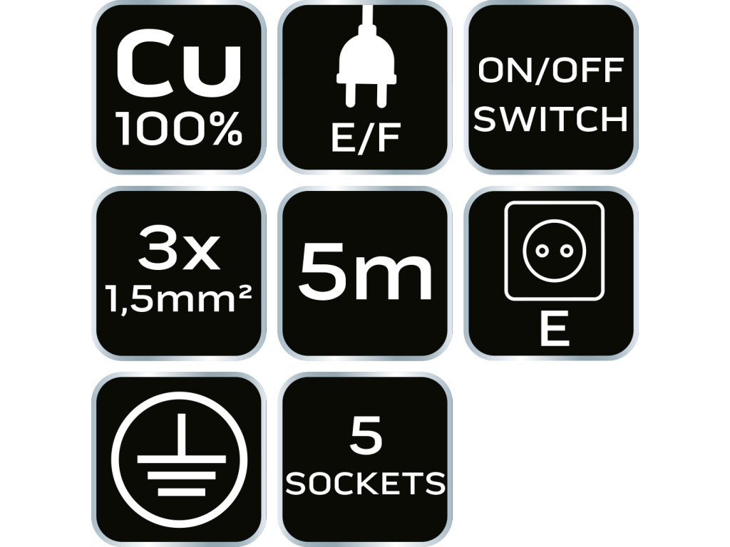 Predlžovací kábel 5 m, 3 x 1,5 mm?, 5 zásuviek, biely, ON/OFF 90-181 od spoločnosti NEO TOOLS je 5 m dlhý predlžovací kábel s 3x 1,5 mm? medenými vodičmi a 5 zásuvkami. Vyznačuje sa bielou farbou a vypínačom ON/OFF. S menovitým prúdom 16 A pri 230 V a jeho maximálnym výkonom 3680 W je schopný napájať väčšinu spotrebičov. Predlžovacia lišta NEO TOOLS má zástrčku typu E/F a zásuvku typu E. Je to užitočný univerzálny výrobok na bezpečné rozvetvenie napájania.