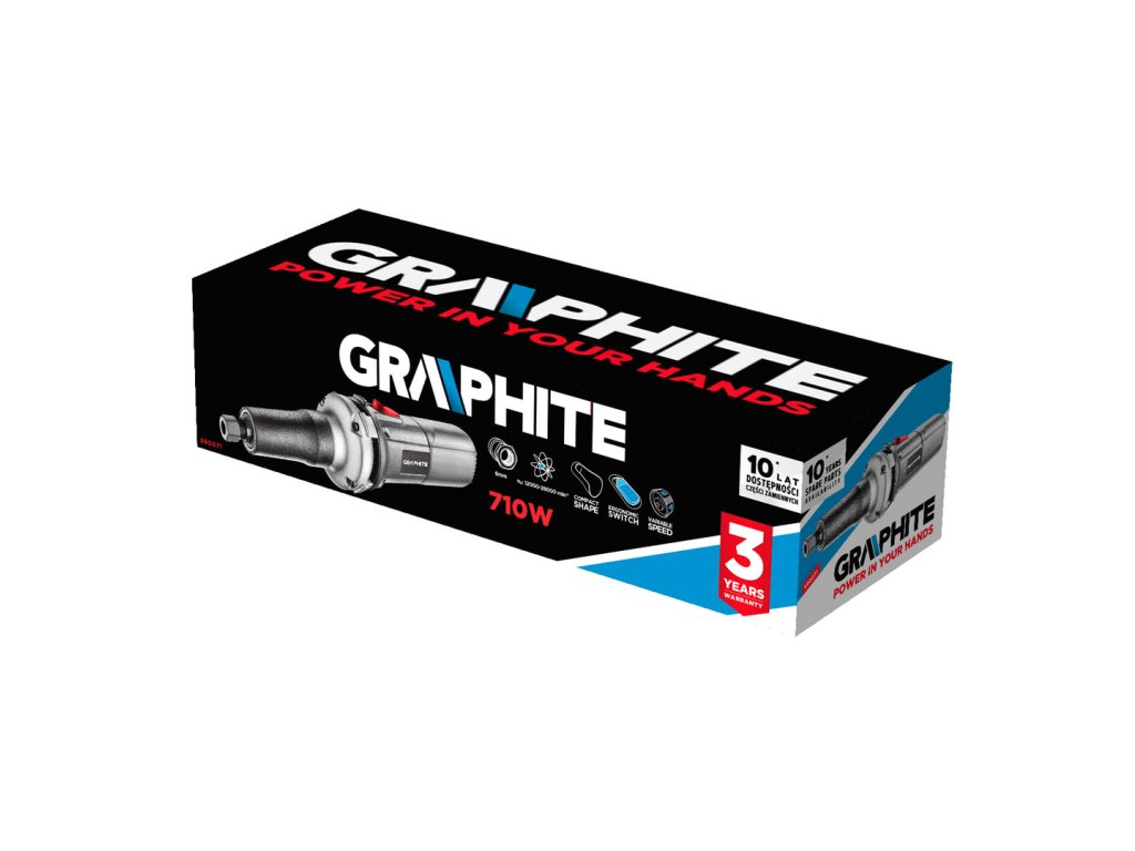 Vysoko kvalitná uhlová brúska GRAPHITE s motorom s výkonom 710 W je určená na rezanie, brúsenie a leštenie materiálov s rôznou štruktúrou a tvrdosťou. Zvlášť pomocná pri brúsení materiálov po zváraní. Maximálny priemer kotúča je 125 mm Zariadenie kvôli svojmu ergonomickému tvaru a dôkladnému vyváženiu poskytuje vysoké pohodlie práce. Pretiahnuté vreteno umožňuje prístup do úzkych priestorov. Brúska je pre bezpečnosť bola vybavená blokádou proti náhodnej aktivácii, vretená sú osadené do liatej hliníkovej skrine. Vhodné usporiadanie vetracích otvorov bráni prehriatiu motora. Zariadenie má funkciu plynulej regulácie otáčok. Rýchlosť otáčok hlavy je 12000 až 28000 otáčok za minútu. Ponôka možnosť samostatnej výmeny opotrebovaných uhlíkových kief. Zariadenie je vybavené pružným a odolným napájacím káblom v gumovom obale s dĺžkou 3 m, ktorý je tiež určený na profesionálne a priemyselné použitie tak v interiéri, ako aj v exteriéri. Súčasťou sady s brúskou sú montážne kľúče. Súlad s európskymi bezpečnostnými normami potvrdzuje certifikát CE.