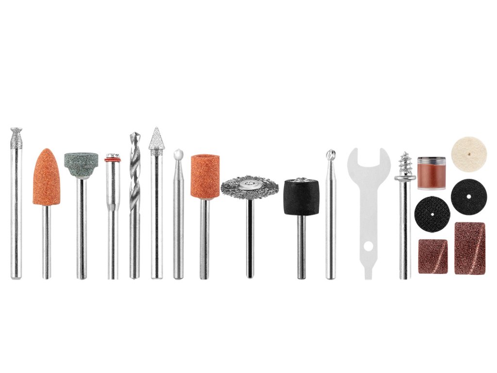 18 V akumulátorová minibrúska bez akumulátora na dokončovacie práce: brúsenie, rezanie, gravírovanie, odihlovanie, frézovanie. Rýchlosť 5000 - 33000/min. Priemer vretena minibrúsky a priemer skľučovadla je 3,2 mm. Pružný hriadeľ dlhý 1 m. Príslušenstvo: 5x rezný kotúč, 10x brúsny papier, 3x brúsny kotúč so skľučovadlom 3,2 mm, 2x brúsna podložka, 6x brúsny pás, 1x vrták, 3x diamantové vrtáky 3,2 mm, 2x tŕň 3,2 mm, 4x plstený kotúč, 1x oceľová drôtená kefa 3,2 mm, 1x kľúč, 1x leštiaca hmota, 1x fréza Hss 3,2 mm. Hmotnosť 1,12 kg.