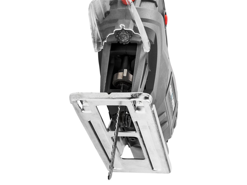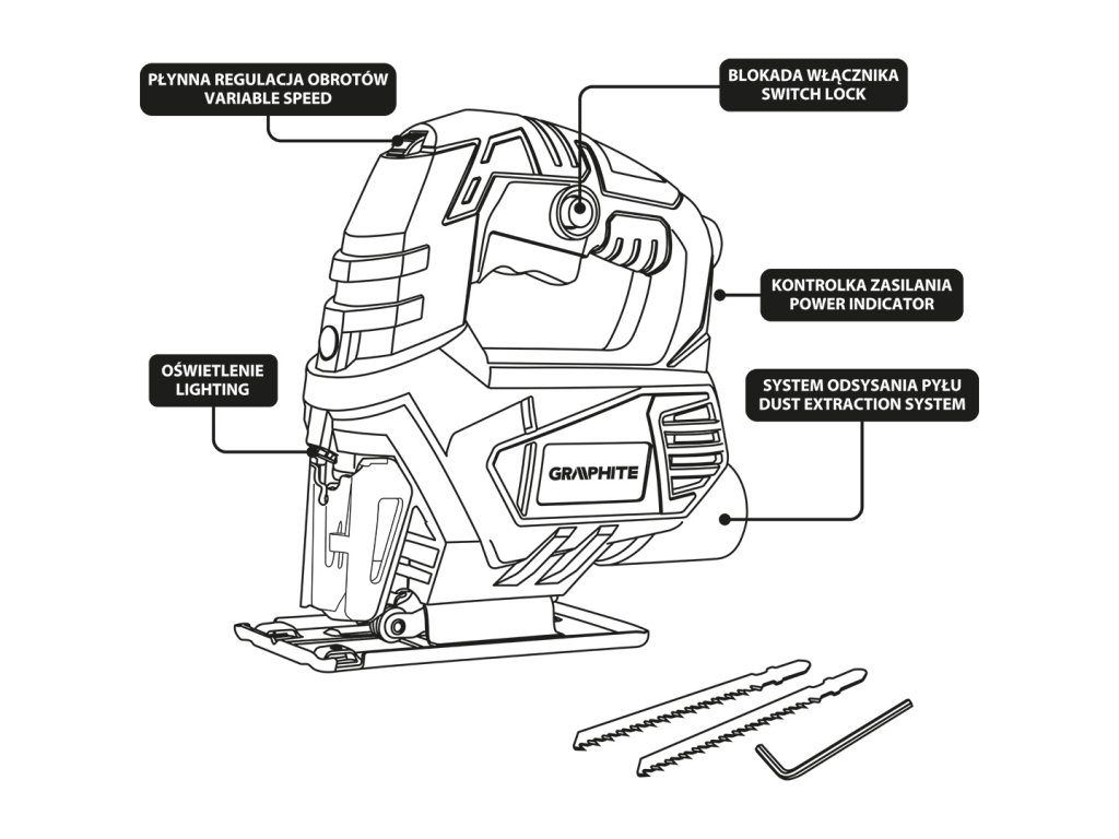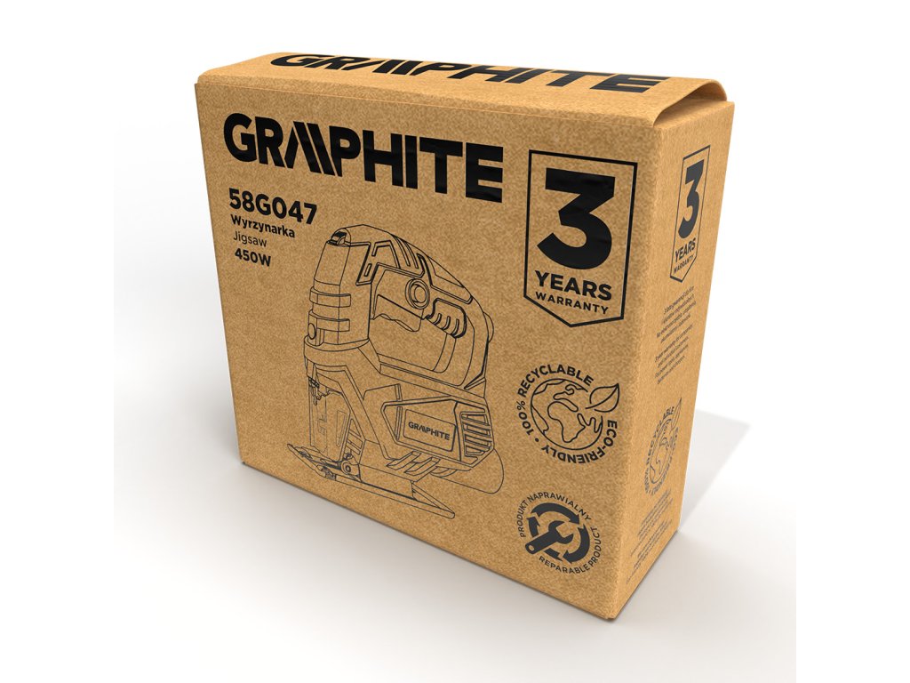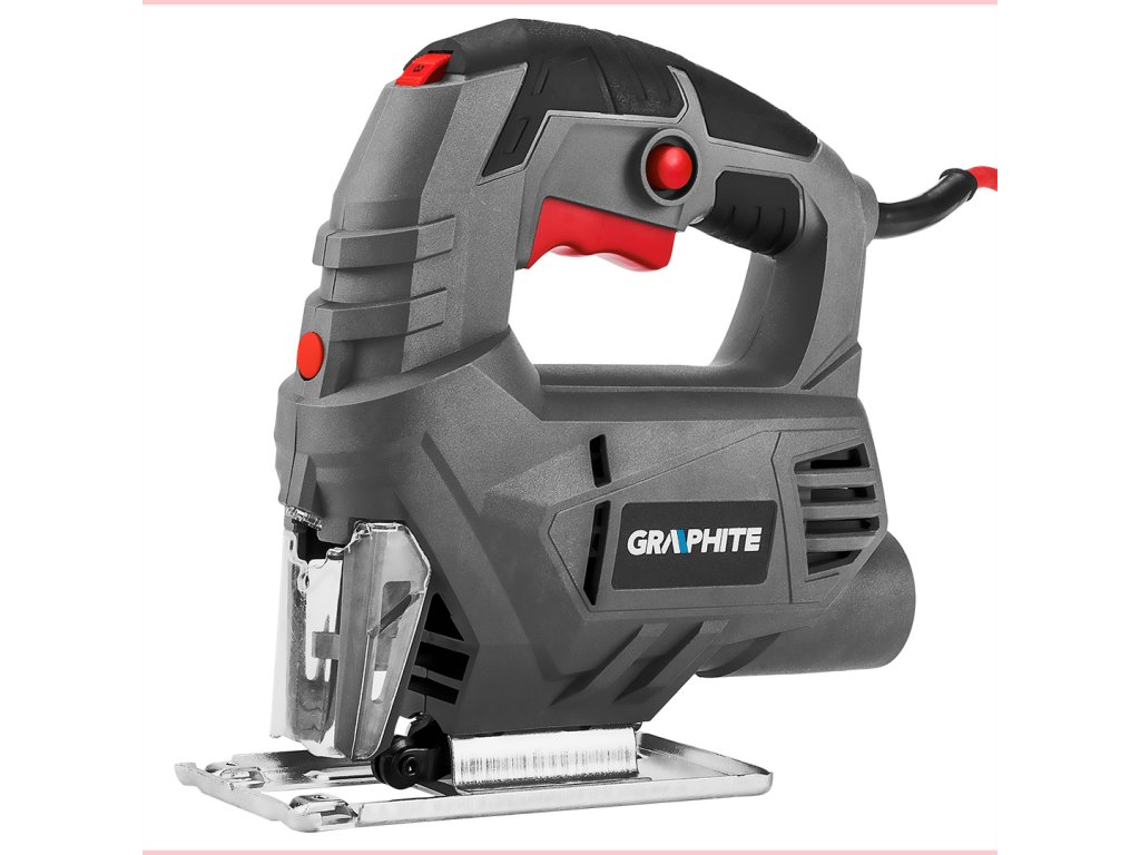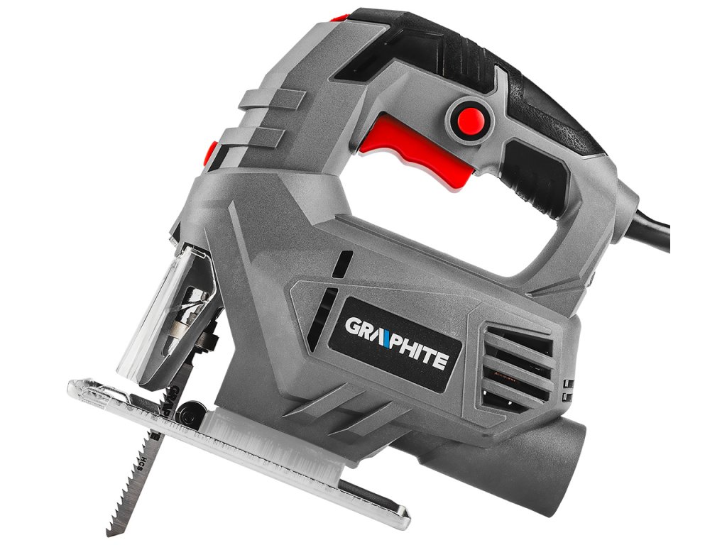 Priamočiara píla GRAPHITE 58G047 na presné a rýchle rezanie dreva a kovu s maximálnou hrúbkou 55 mm dreva a 6 mm ocele. Určené pre profesionálov a poloprofesionálov. Regulácia otáčok umožňuje pracovať s rýchlosťou od 0 do 3000 zdvihov za minútu. Skicová píla má pätku s nastavením uhla sklonu v rozsahu 0-45? doprava a doľava. Osvetlenie pracovného miesta zvyšuje komfort používania. Skicovací kotúč je chránený priehľadným krytom z odolného polykarbonátu. Súčasťou výrobku je odsávanie prachu z povrchu obrobku.