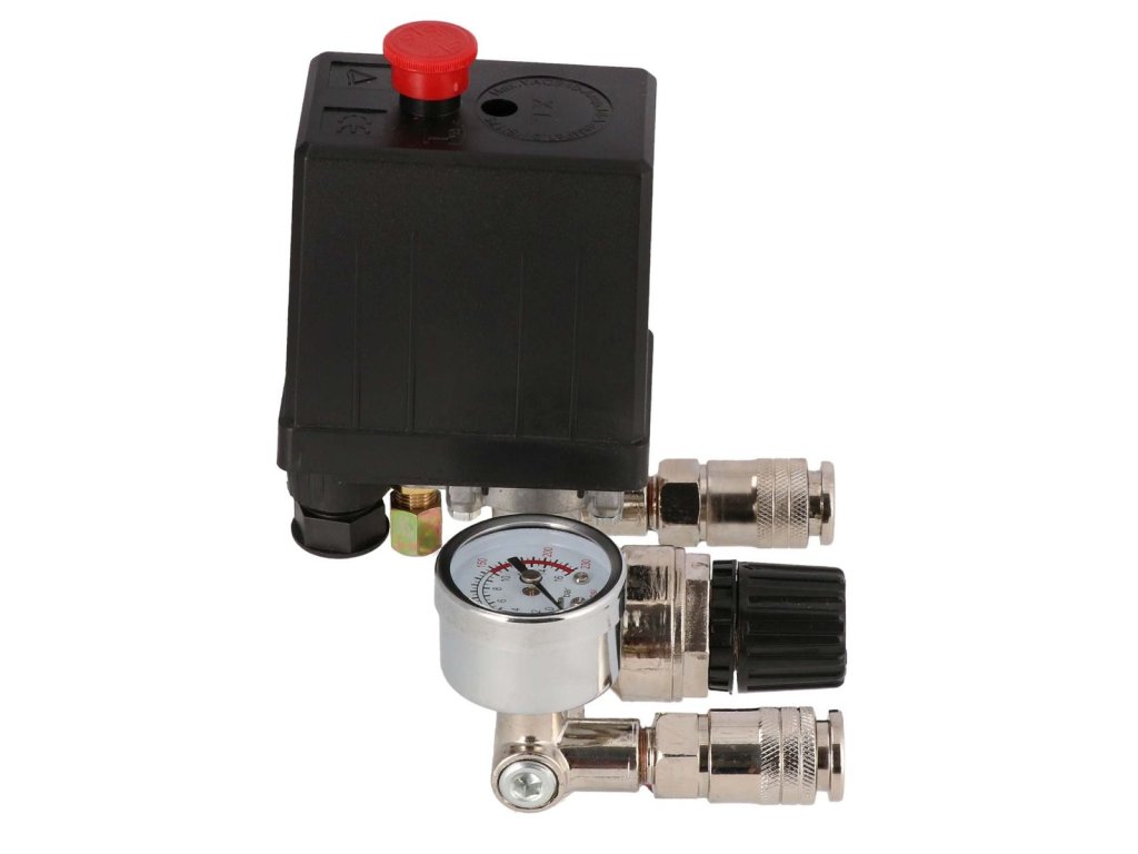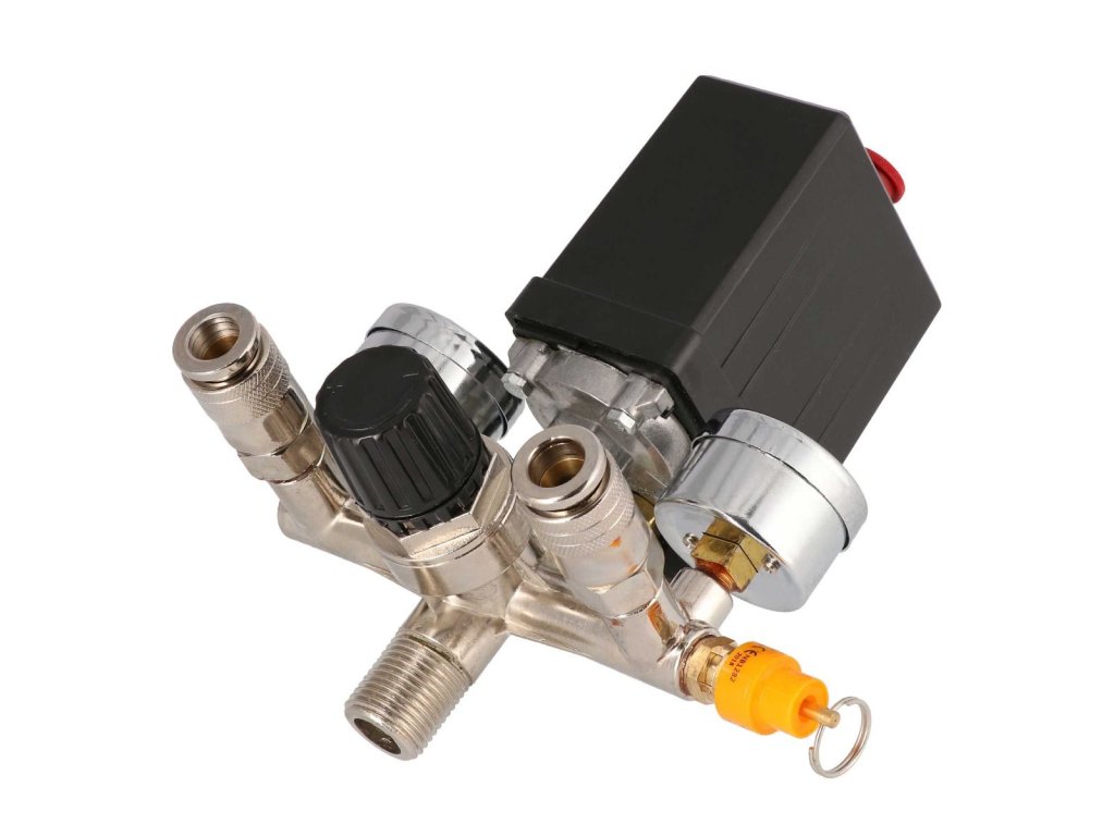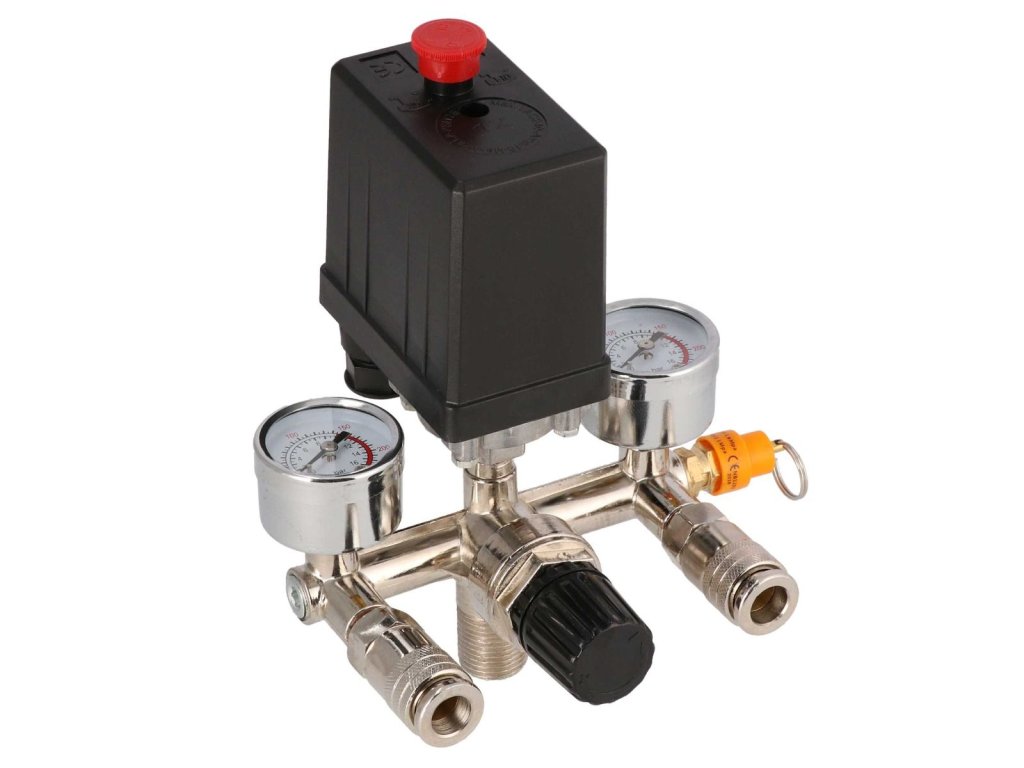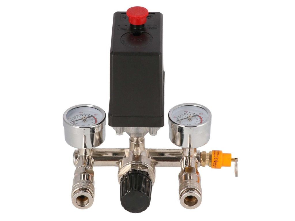 Do kompresorov osadených na nádržiach 6 - 90L Súprava obsahuje: - Regulator - Tlaku vypínač - Bezpečnostný ventil - Rýchlospojka 2 ks - Manometer 2 ks