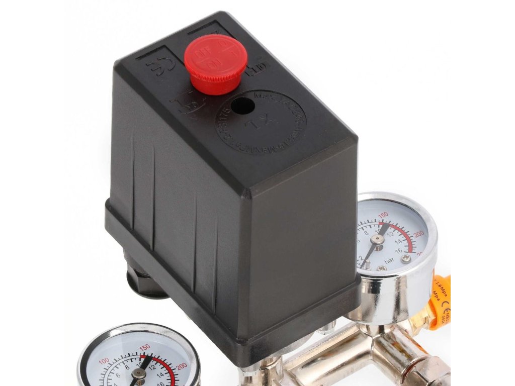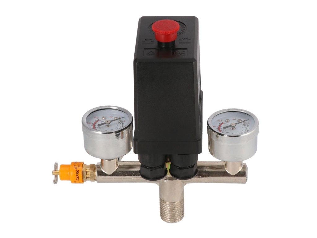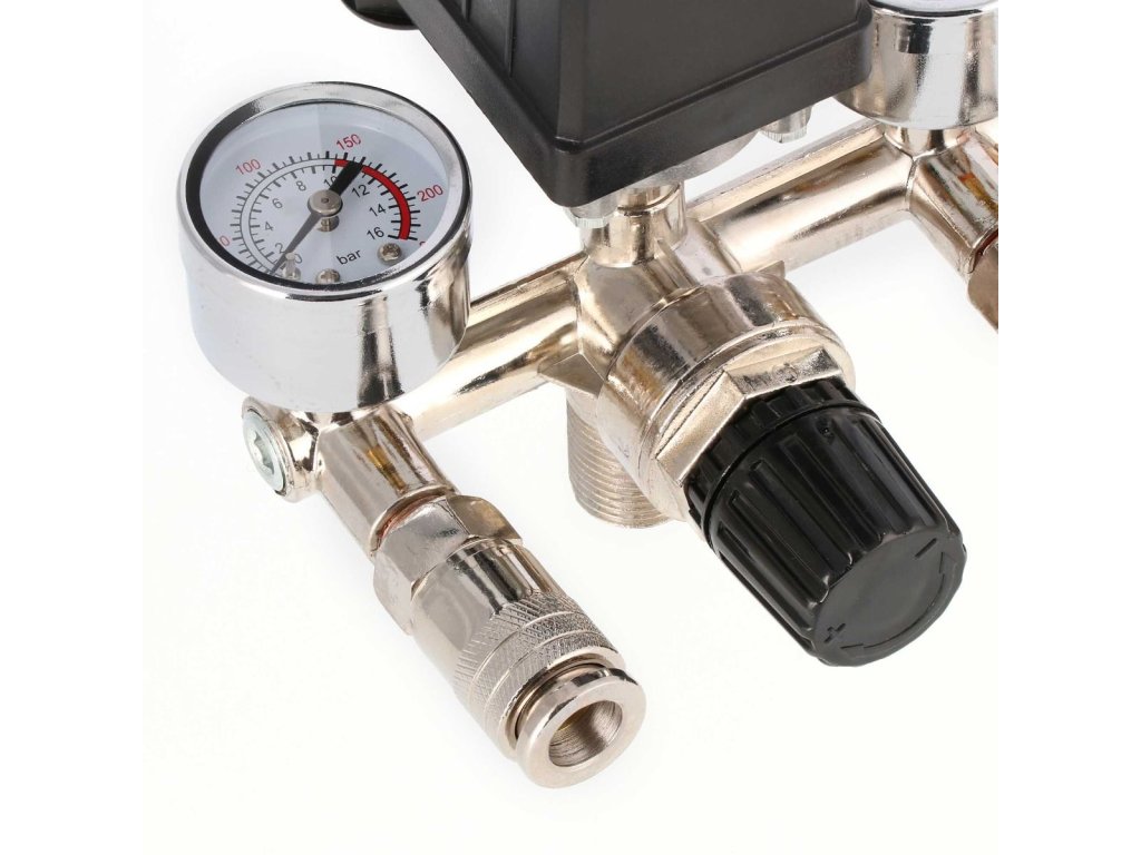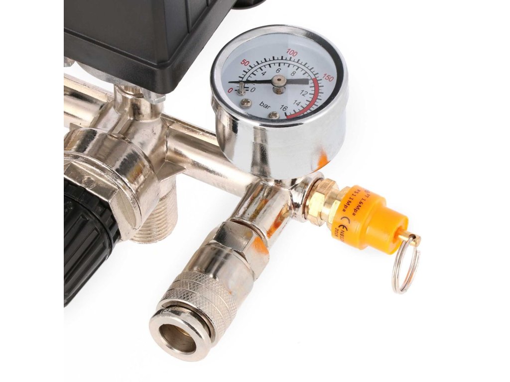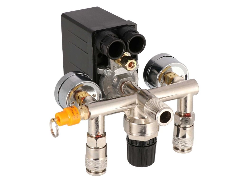 Do kompresorov osadených na nádržiach 6 - 90L Súprava obsahuje: - Regulator - Tlaku vypínač - Bezpečnostný ventil - Rýchlospojka 2 ks - Manometer 2 ks