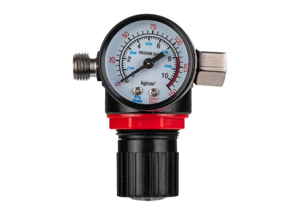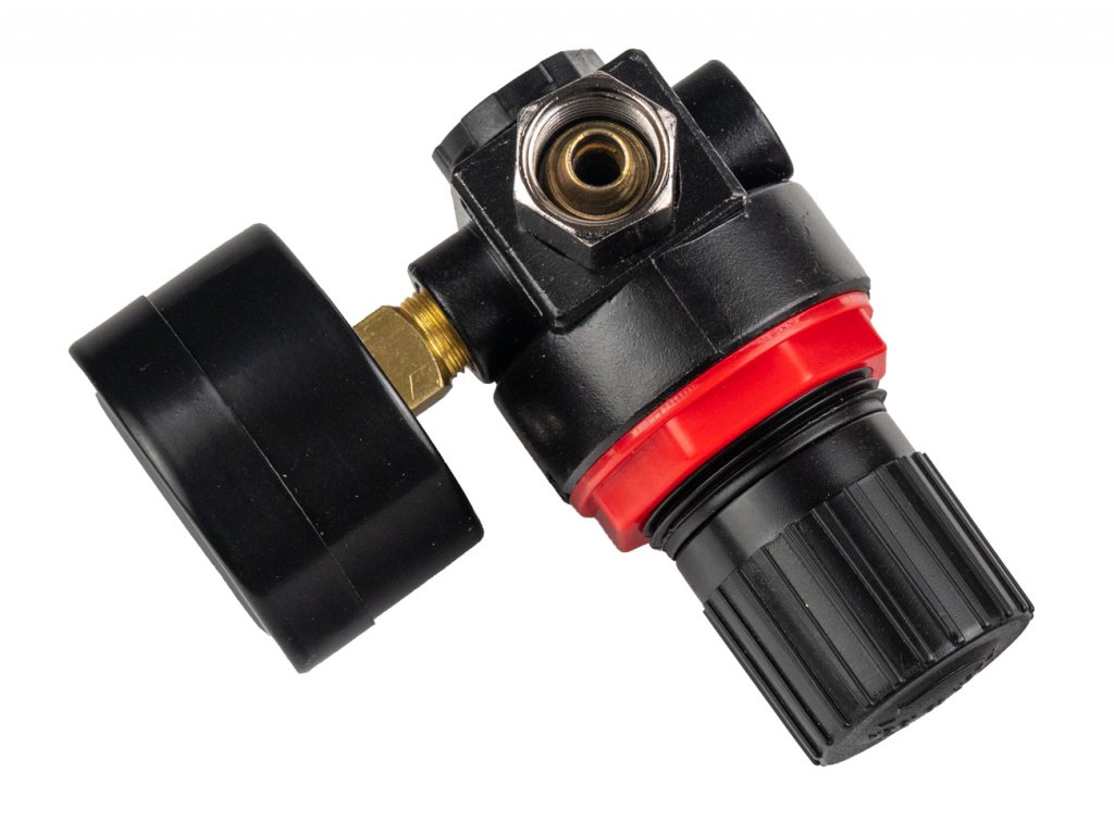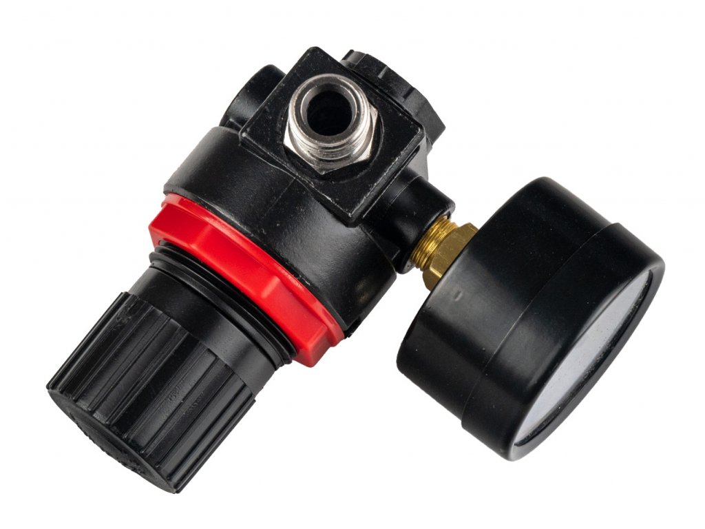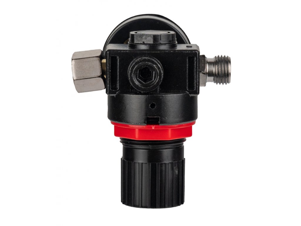 1/4 "regulátor tlaku vzduchu Znižuje tlak a udržiava konštantný pracovný tlak v pneumatickom systéme. Ovládač s dorazom umožňuje presné nastavenie požadovaného výstupného tlaku. Regulátor zaručuje efektívnu prevádzku pneumatických nástrojov vyžadujúcich konštantný tlak.
