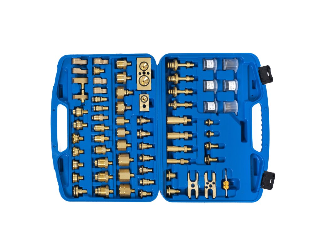 Jeden z najlepších profesionálnych súprav adaptérov na preplachovanie klimatizácií na trhu, určený pre väčšinu rozmerov hadíc a modelov/ značiek dostupných na trhu – pasuje k väčšine zariadení na preplachovanie klimatizácií.Umožňuje pripojenie pomocou univerzálnych aj špeciálnych konektorov, napríklad pre hadice typu spring-lock.
