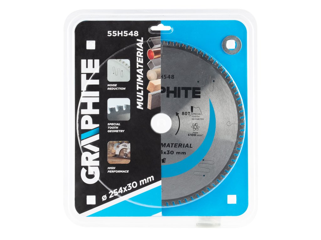 Vidlicový pílový kotúč GRAPHITE (ref. 55H548) s vonkajším priemerom 254 mm a vnútorným priemerom 30 mm má 80 zubov, umožňuje vyššiu rýchlosť rezania. Čepeľ je založená na špeciálnej konštrukcii ozubenia a použití špeciálneho karbidu. Univerzálny nôž, ktorý sa nemusí vymieňať pri zmene rezaného materiálu. Zuby FWF vďaka svojej špeciálnej konštrukcii a širokej hrebeňovej časti poskytujú záruku odolnosti voči zaťaženiu. Vhodné na rezanie rôznych materiálov, ako sú oceľové a hliníkové profily a iné neželezné kovy, napríklad meď, plasty, drevo s malými klincami, OSB dosky, preglejky, konáre, lamináty atď. Použitie kompenzačných zárezov znižuje hladinu hluku a drážky zvyšujú stabilitu noža a presnosť rezu. Široký kotúč zabezpečuje čistý rez.