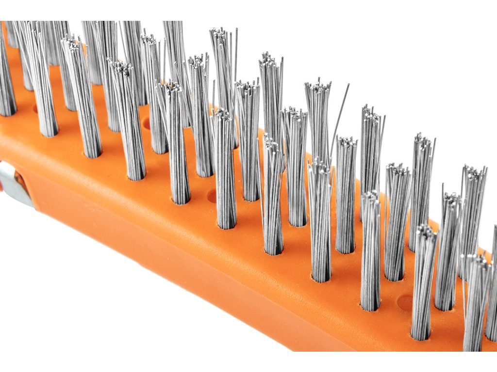 Trojradová drôtená kefa NEO (ref. 39-052) je určená na odstraňovanie hrdze a iných nečistôt z rôznych povrchov. Štetiny kefy sú vyrobené z drôtov z nehrdzavejúcej ocele. Dvojzložková protišmyková rukoväť zabraňuje vykĺznutiu výrobku z ruky.