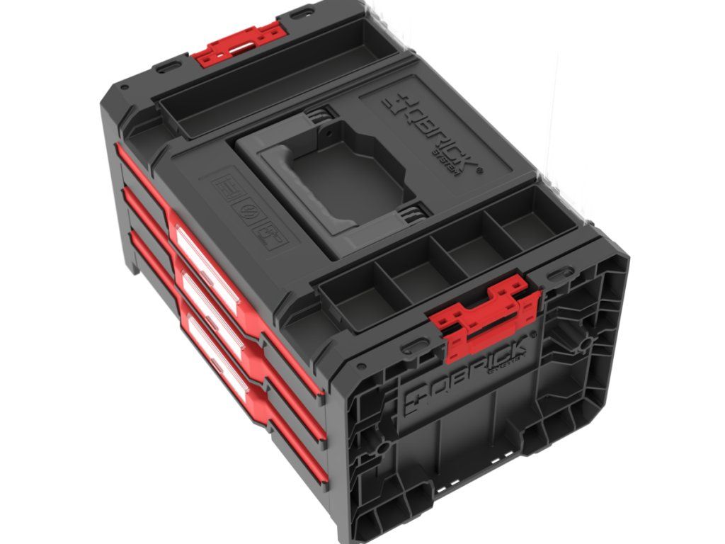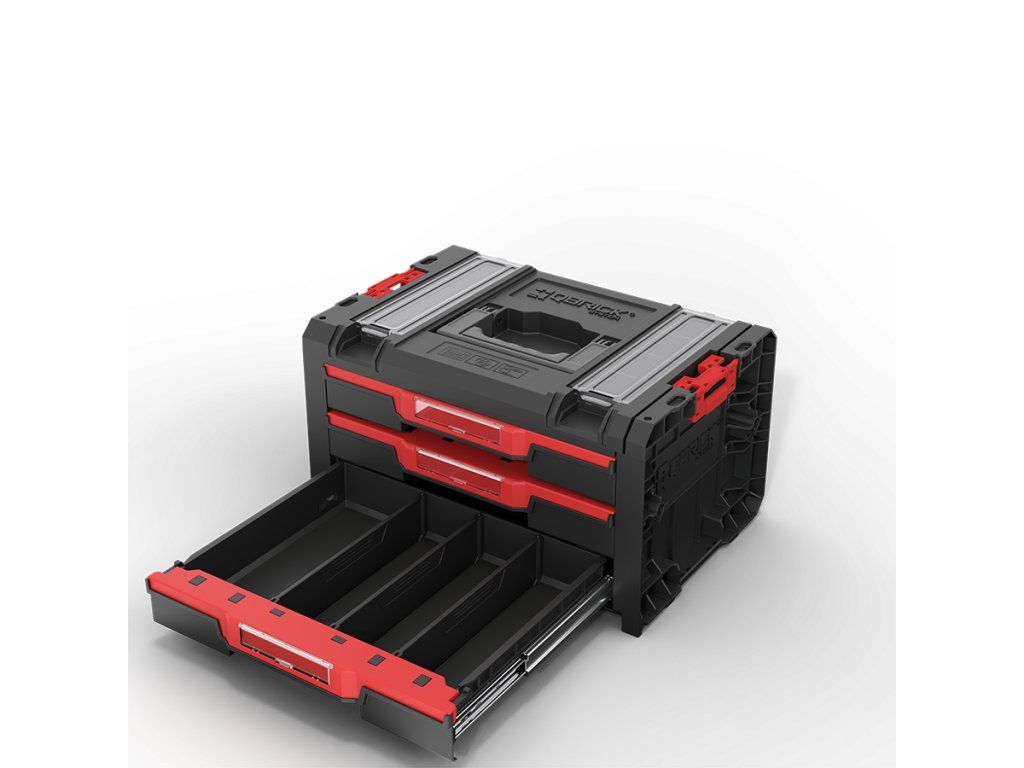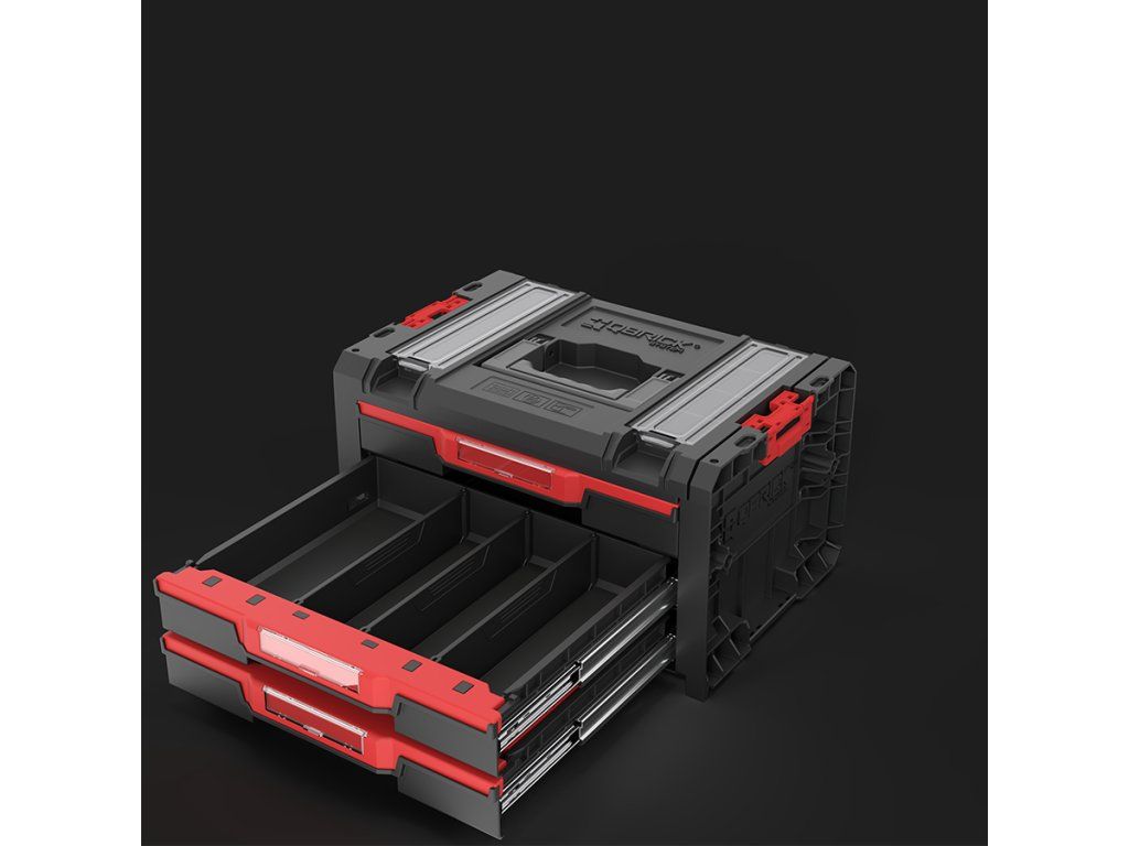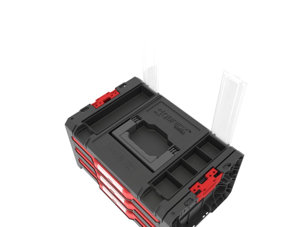 Qbrick System PRO Drawer 3 Toolbox 2.0 Profi Basic je priestranný, modulárny box na náradie vybavený tromi zásuvkami, ktoré sa vysúvajú po kovových vodiacich lištách. Praktické tlačidlo umožňuje jednoduchý prístup k ich obsahu. Základná verzia zásuvky je vybavená deviatimi nastaviteľnými priehradkami na organizáciu náradia a dielenského príslušenstva.