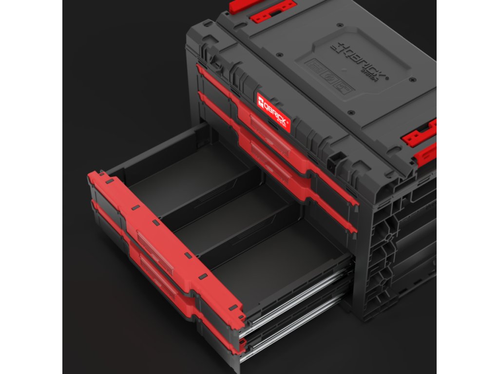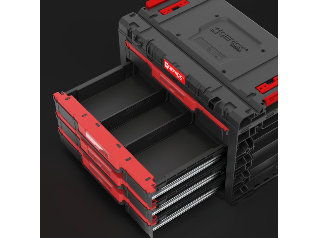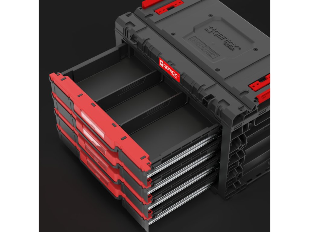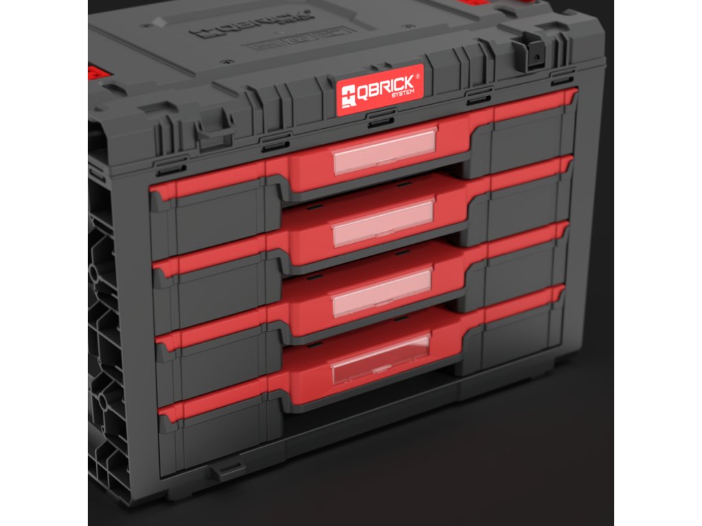 Základný box na náradie Qbrick System PRIME Drawer 4 Toolbox je veľmi priestranný, modulárny box na náradie. Obsahuje štyri zásuvky, ktoré sa vysúvajú po kovových vodiacich lištách. Praktické tlačidlo umožňuje jednoduchý prístup k ich obsahu. Každá zo štyroch nízkych zásuviek má objem 5,3 litra. Každá zo štyroch zásuviek je vybavená dvoma nastaviteľnými prepážkami.