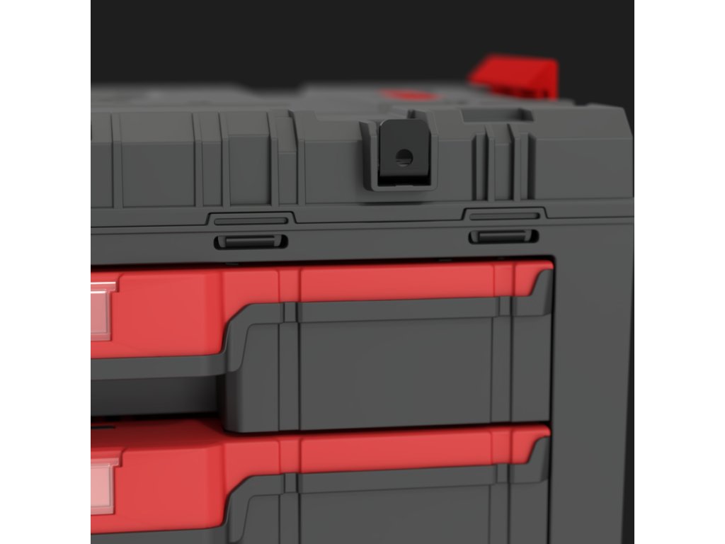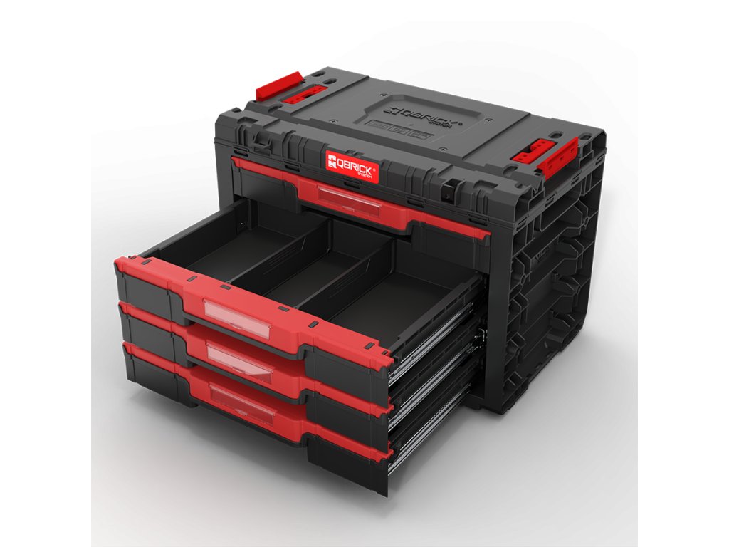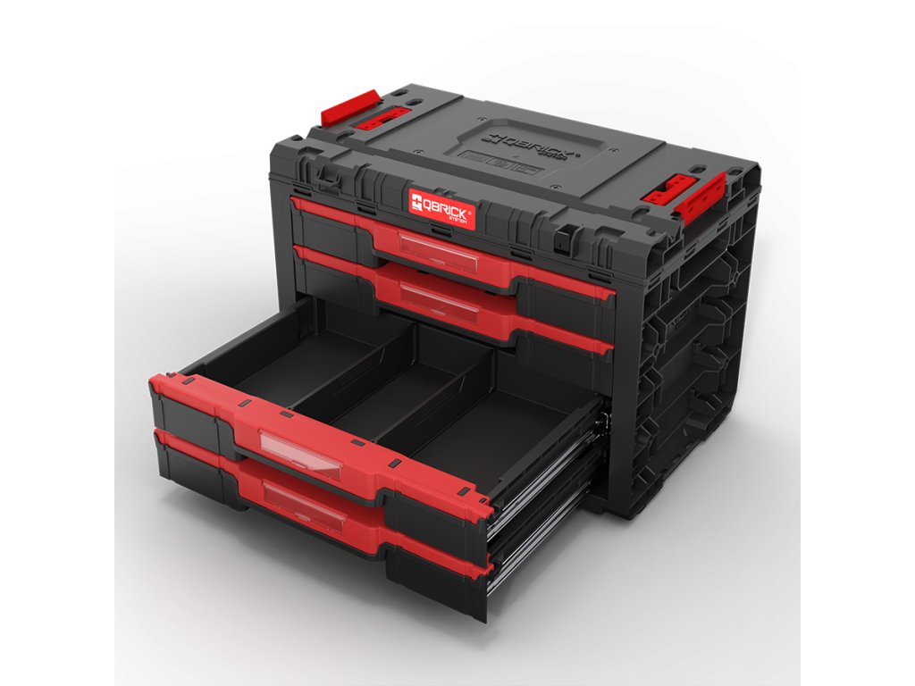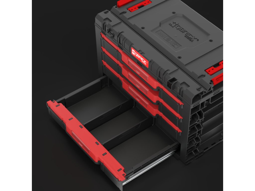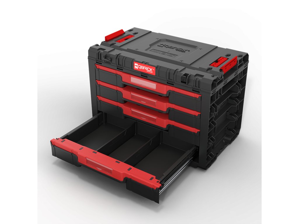 Základný box na náradie Qbrick System PRIME Drawer 4 Toolbox je veľmi priestranný, modulárny box na náradie. Obsahuje štyri zásuvky, ktoré sa vysúvajú po kovových vodiacich lištách. Praktické tlačidlo umožňuje jednoduchý prístup k ich obsahu. Každá zo štyroch nízkych zásuviek má objem 5,3 litra. Každá zo štyroch zásuviek je vybavená dvoma nastaviteľnými prepážkami.
