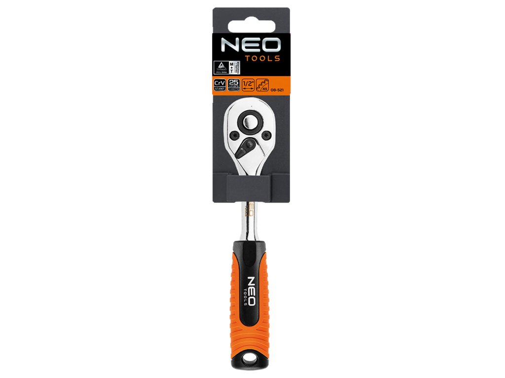 NEO 1/2" račňa (ref. 08-521) s dĺžkou 265 mm, s telom z chróm-vanádiovej ocele, vyrobená v súlade s normou DIN 3122. 45-zubový račňový mechanizmus je vyrobený z mimoriadne odolnej chróm-molybdénovej ocele, ktorá predlžuje životnosť nástroja. Ergonomická rukoväť z dvoch materiálov zvyšuje pohodlie pri práci. Kvalita náradia potvrdená certifikátom TÜV a 25-ročnou zárukou výrobcu. Značka NEO spĺňa očakávania profesionálov.