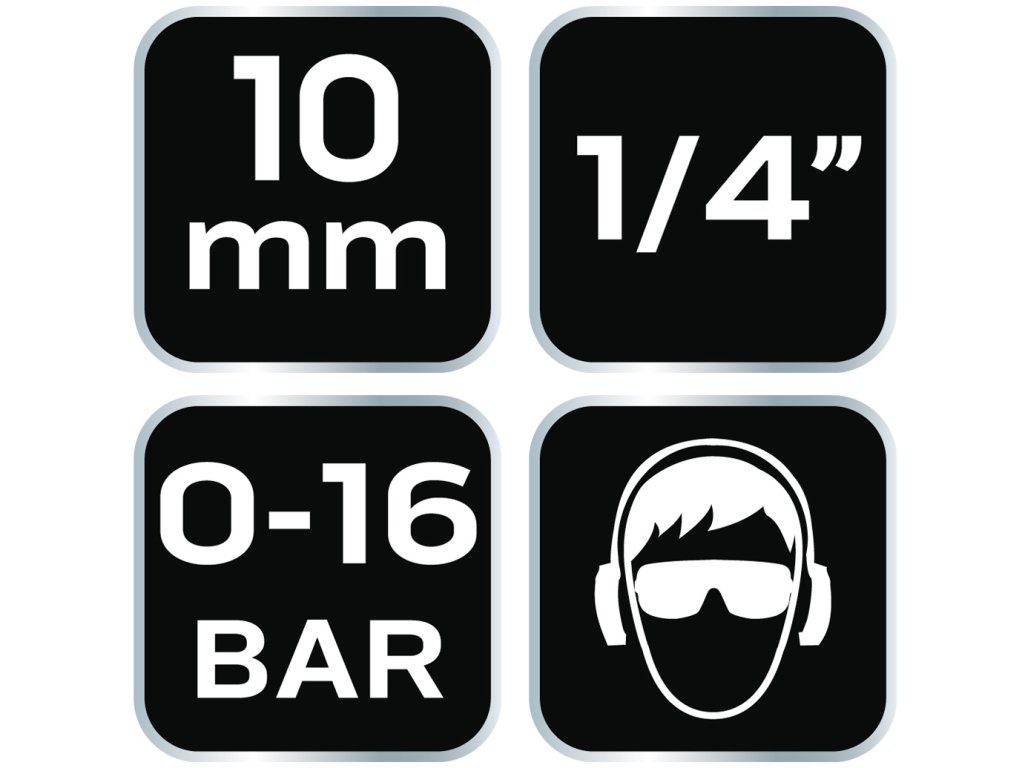 Hadicová spojka NEO 10 mm (ref. 12-616) z vysokokvalitnej mosadze, poniklovaná, s vonkajším závitom M 1/4". Vonkajší priemer 10 mm. Maximálny prevádzkový tlak 16 barov. Výrobok s označením CE, ktoré potvrdzuje zhodu s bezpečnostnými smernicami. Značka NEO spĺňa očakávania profesionálov.