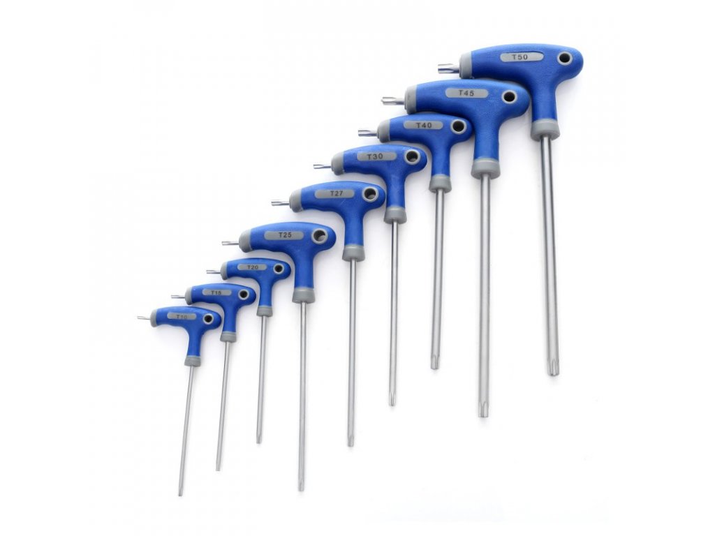 Sada TORX šesťhranných T-kľúčov s dĺžkou od 100 do 200 mm. V balení sa nachádza 9 kľúčov.