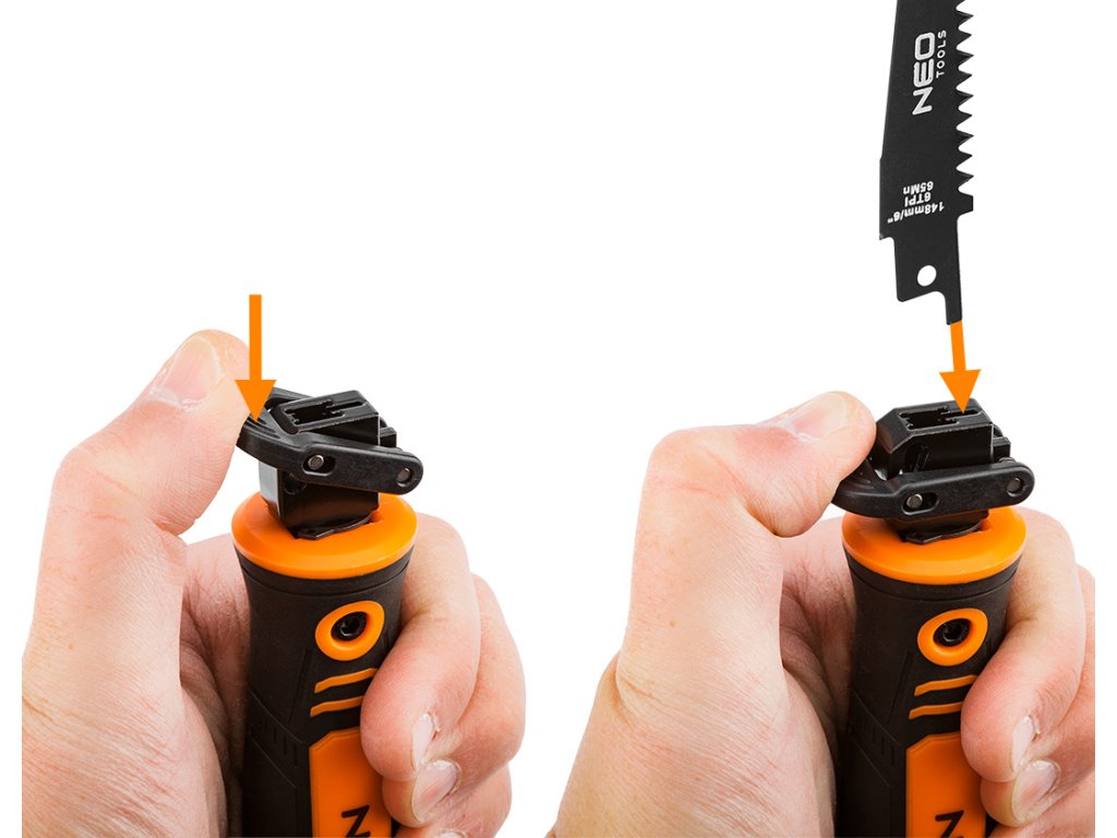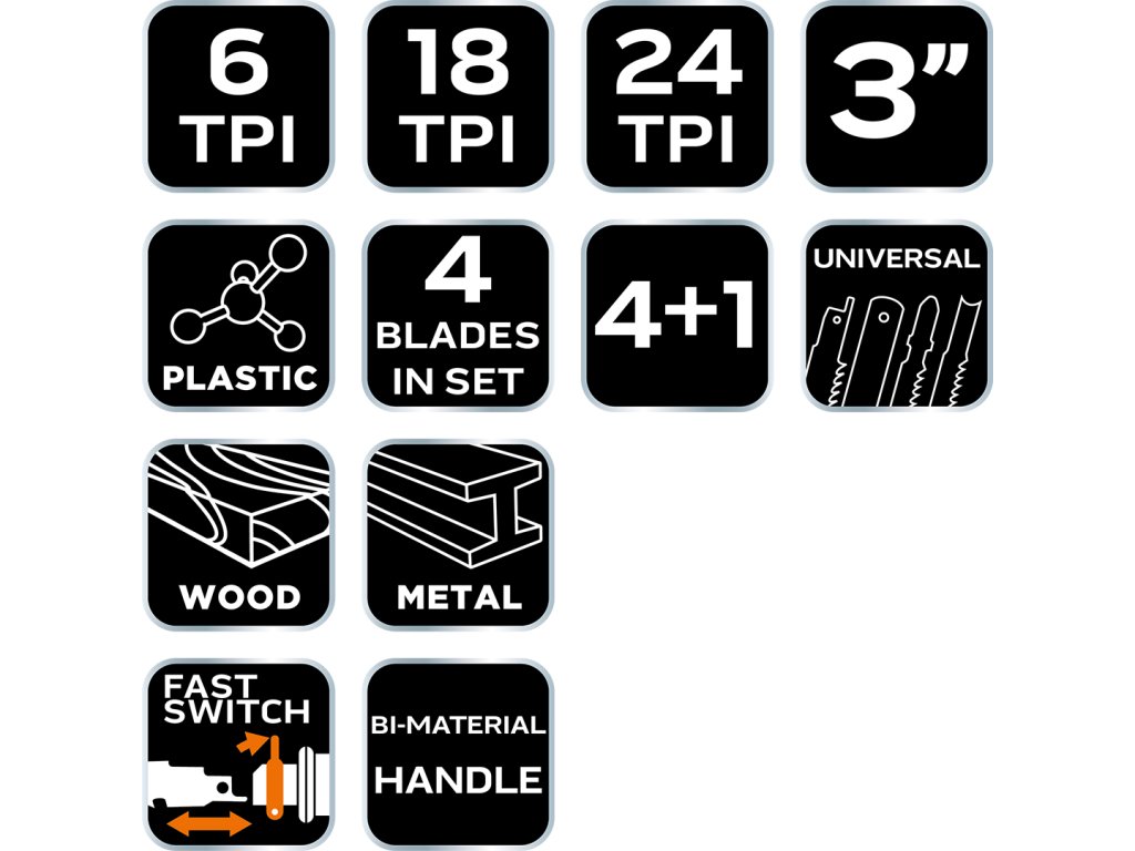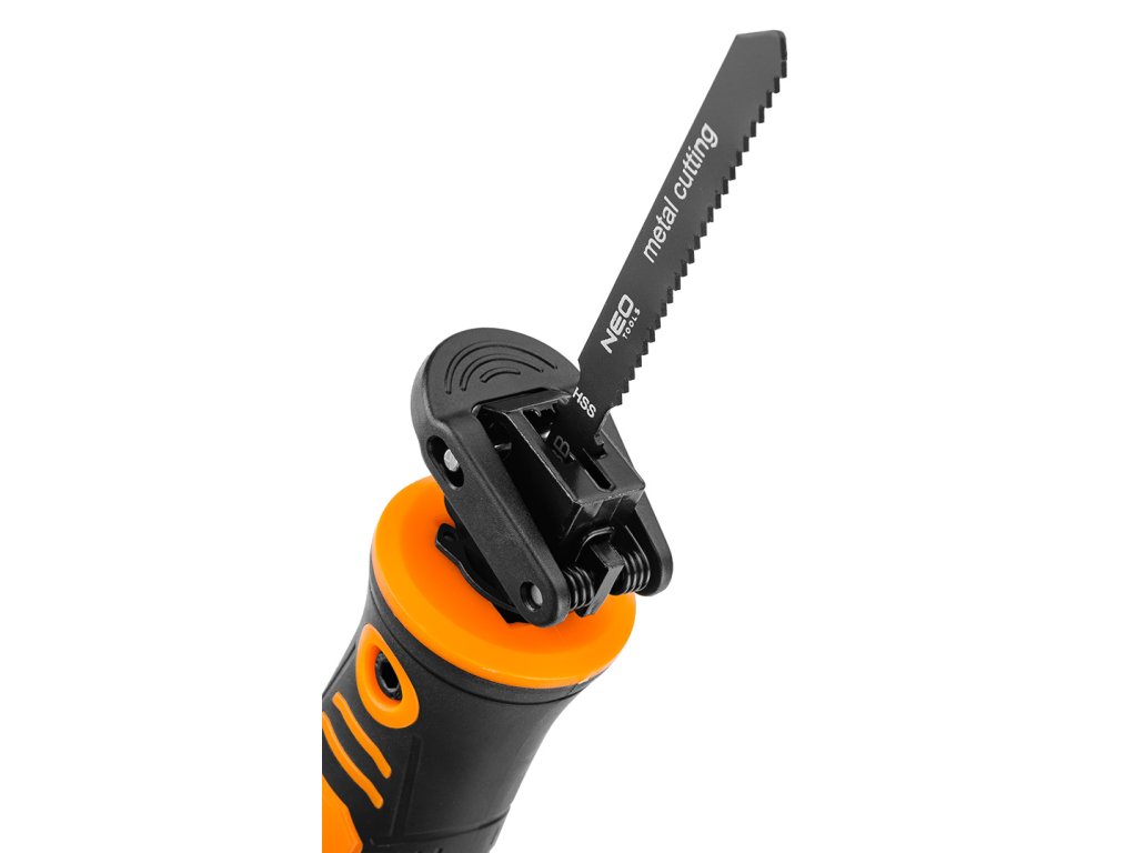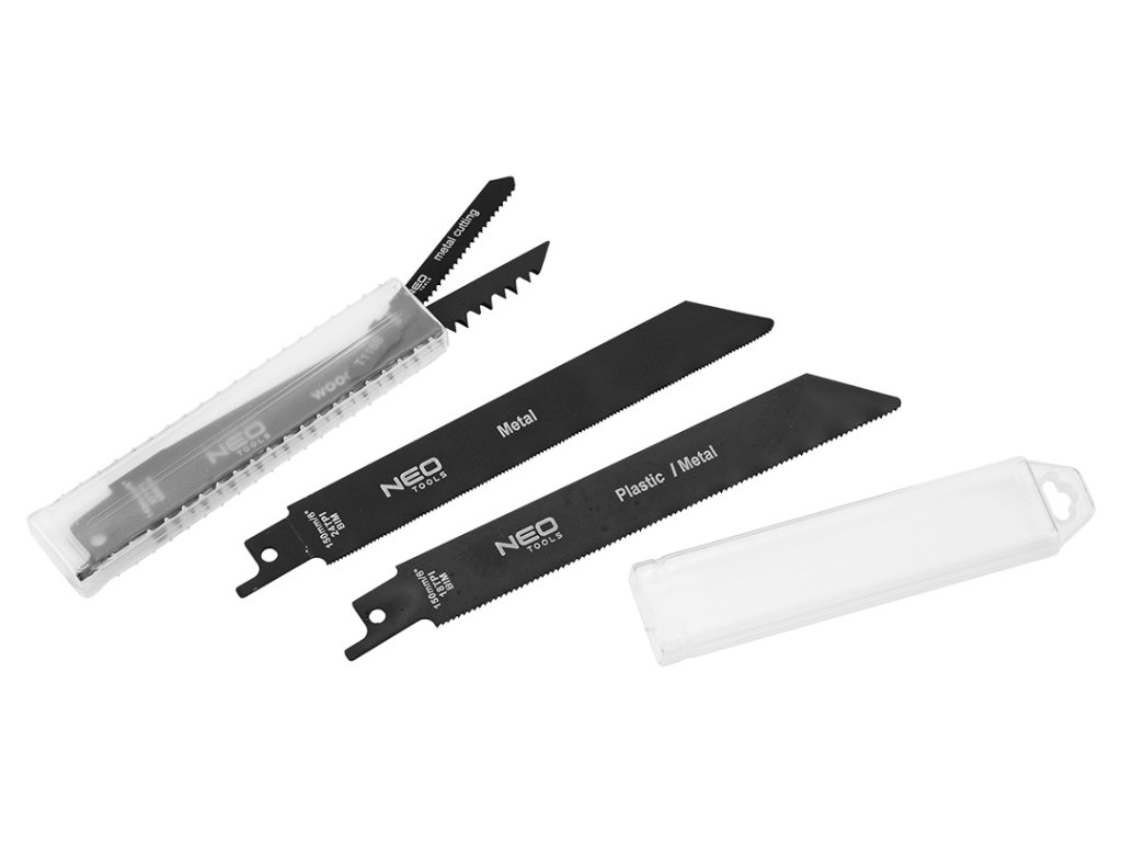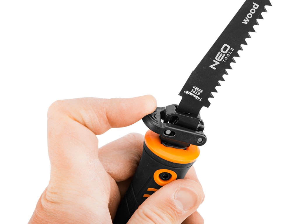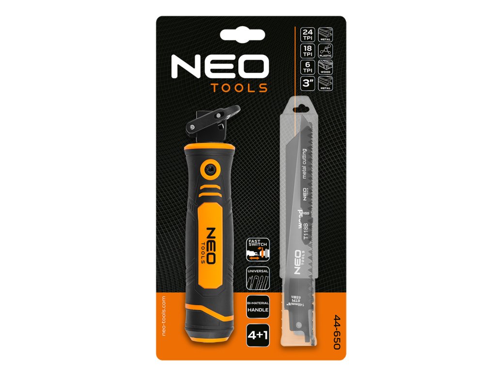 Držiak pílových listov, univerzálny, sada 4 + 1, 44-650 od spoločnosti NEO TOOLS je sada pozostávajúca z držiaka a štyroch rôznych typov pílových listov. Ponúkaný univerzálny držiak pre všetky typy pílových listov, bol vybavený konektorom s dvoma zásuvkami, ktorý umožňuje ich rýchlu inštaláciu, bez použitia ďalšieho náradia. Je kompatibilný s pílovými listami (typ T,U), šabľovými pílovými listami (typ S) a 12,5 mm kovovými listami. Súčasťou balenia sú aj štyri pílové listy: 24 TPI na kov (dvojmateriál), 18 TPI na plast/kov (dvojmateriál), 6 TPI na drevo (uhlíková oceľ), 3" kotúč na kov. Rukoväť značky NEO TOOLS sa vyznačuje vhodnou ergonómiou - aj vďaka dvojzložkovej konštrukcii. Ide o univerzálne náradie odporúčané na rezanie rôznych druhov materiálov.