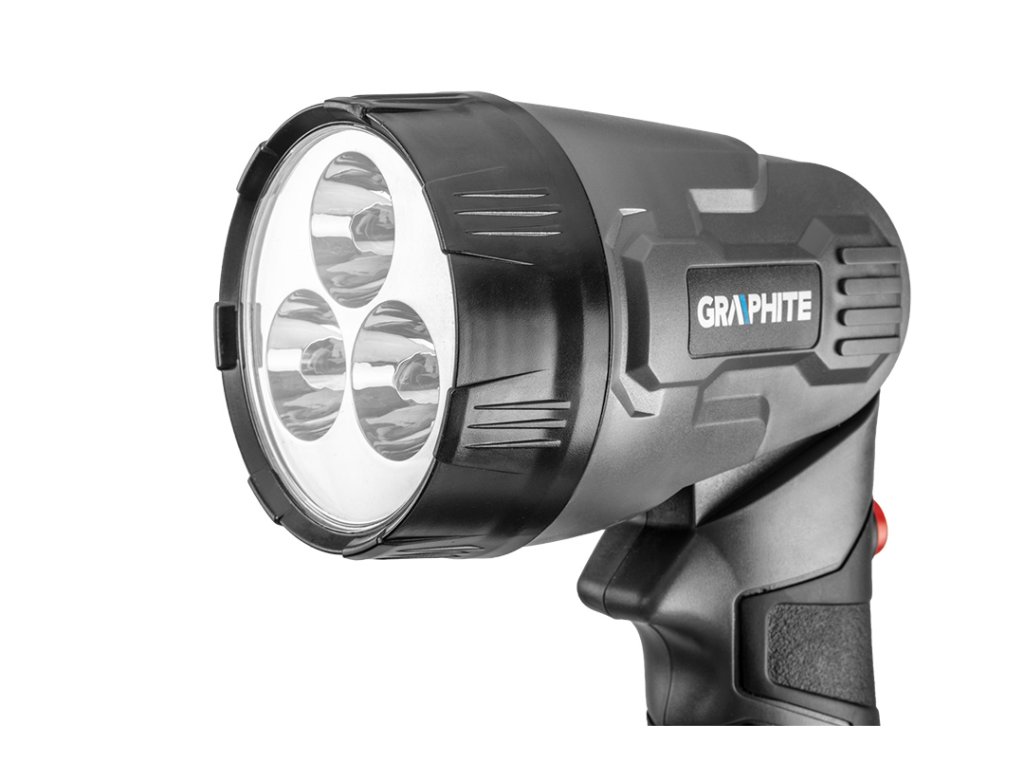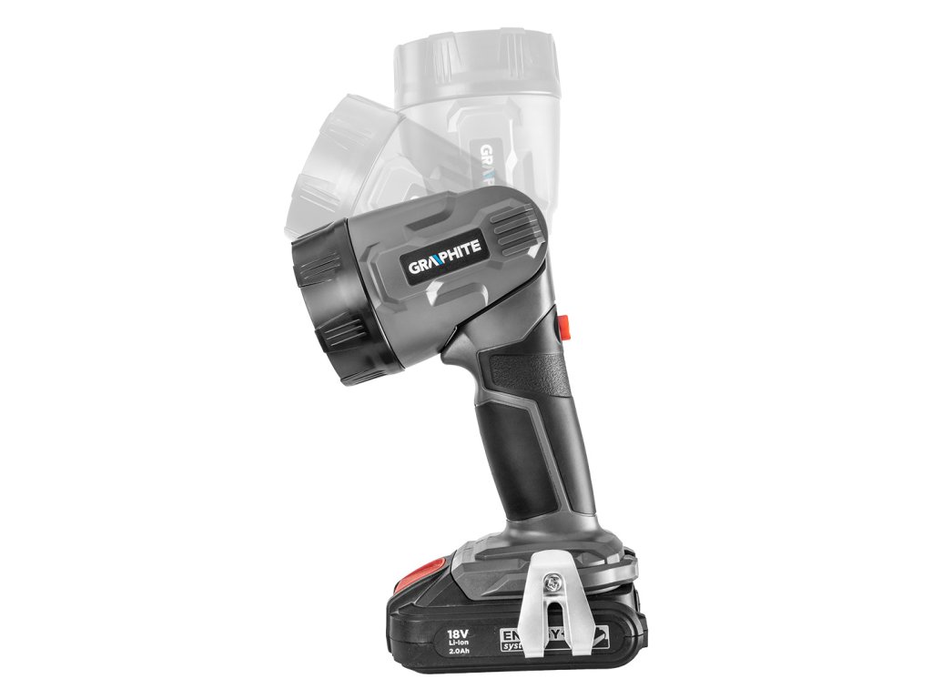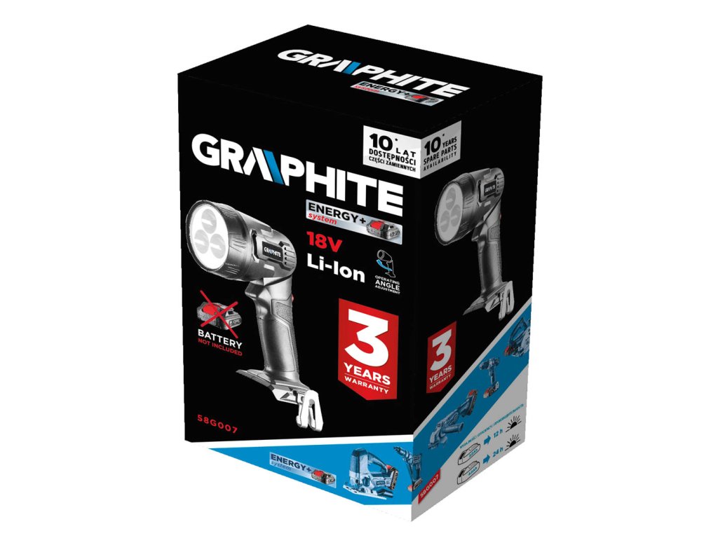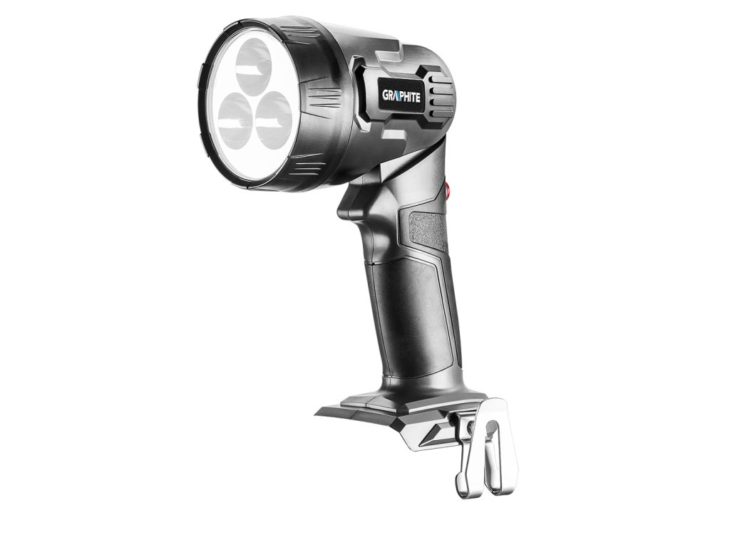 Svietidlo GRAPHITE, spolupracuje s akumulátormi 18 V Li-Ion GRAPHITE Energy+. Vybavené 3 vysokokvalitnými LED diódami vyžarujúcimi svetlo s teplotou 7000 K. Diódy sa vyznačujú širokým uhlom vyžarovania 120 stupňov a veľkým svetelným tokom 260 lm. V konštrukcii svietidla je použitý 5-polohový kĺb, ktorý poskytuje možnosť prispôsobiť uhol dopadu svetla na vykonávanú prácu. Vďaka ergonomickej rukoväti pokrytej protišmykovým materiálom je možné elektrické náradie pevne uchopiť v ruke. Svietidlo je navyše vybavené kovovou sponou na opasok.