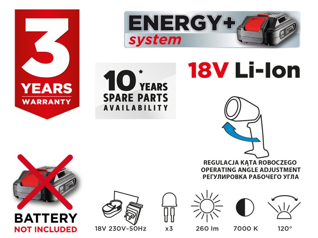 Akumulátorové svietidlo 18 V, Li-Ion, 3 x LED, teplota svetla 7000 K, svetelný tok 260 lm, vyžarovací uhol 120 stupňov, (LxH) 140 x 230 mm, hmotnosť 0,3 kg, kompatibilné s akumulátormi Energy+