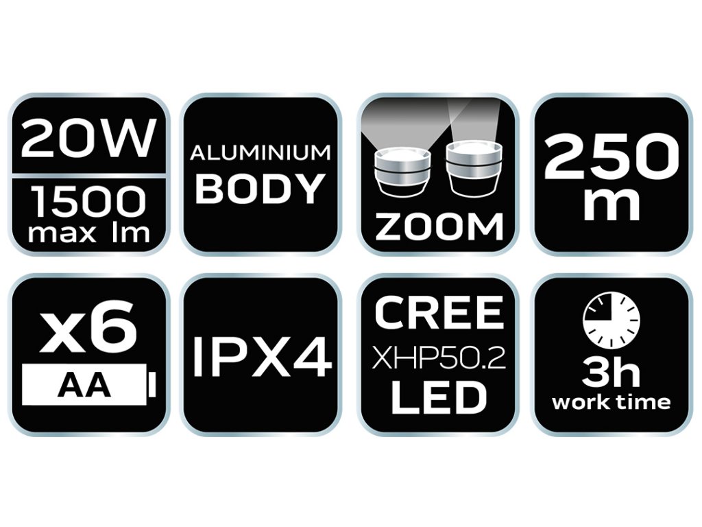 Baterka 6xAA Neo výkon 20W, max. 1500 lúmenov, dosah 250m, LED Cree XHP50.2, IPX4, napájanie 6xAA (nie je súčasťou balenia), 3 svetelné funkcie 100%, 20%, stroboskop, doba prevádzky 3h, hliníkové telo, zoom.