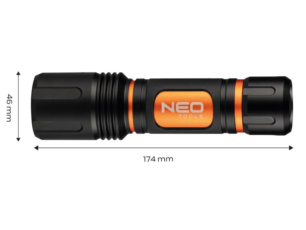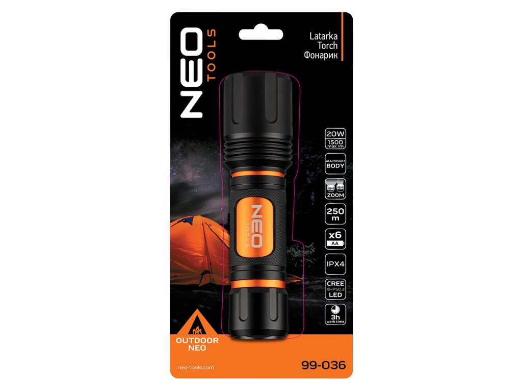 Baterka NEO (ref. 99-036) so zoomom je vybavená modernými LED diódami CREE XHP50.2 so svetelným tokom 1500 lúmenov a výkonom 20 W. Baterka je napájaná 6 batériami AA (nie sú súčasťou balenia). Telo je vyrobené z hliníka. Svietidlo má 3 svetelné funkcie: 100 %, 20 % a stroboskop.
